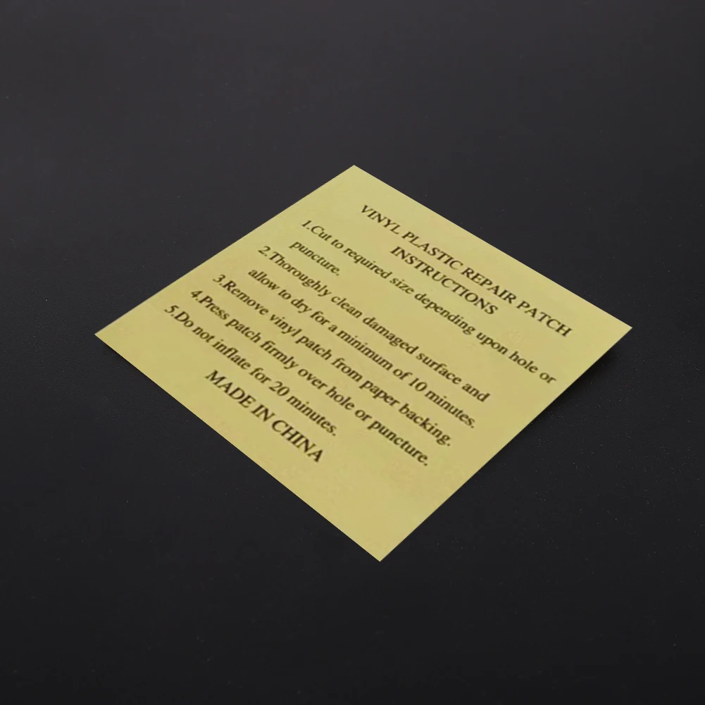 Feature: 1. The product is self-adhesive and can be pasted and used after tearing off the release paper. 2. It is easy to operate and does not touch your hands. 3. Waterproof, strong water resistance, can maintain a good degree of adhesion and fit. Specification: Name: PVC Repair Patch Material: PVC Color: Yellow + White Size: About 50x50mm/1.97x1.97in Net Weight: About 12g Instructions: 1. Dry the damaged area by putting all the air into the product before use. 2. Cut the patch to a little larger than the appropriate size of the breakage. 3. Tear off the patch, and when pasting, you should pay attention to extruding the bubble of the patch to make the repair surface smooth. 4. Wait 20 minutes after pasting before you can use it. Note: Due to the different monitor and light effect, the actual color of the item might be slightly different from the color showed on the pictures. Thank you! Please allow about 1-2cm measuring deviation due to manual measurement. ![]()