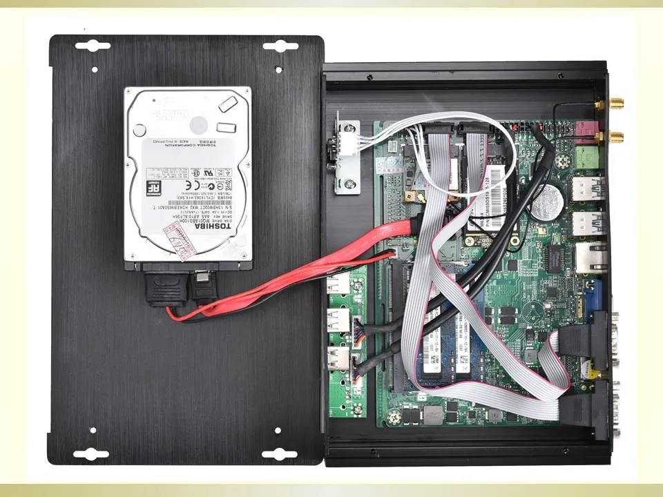 1 x mini pc, 1 x Power Supply, 1 x Power Cable, 1 x HDMI Cable, 2 x WiFi Antennas, 2 x Sata wires, Screws.