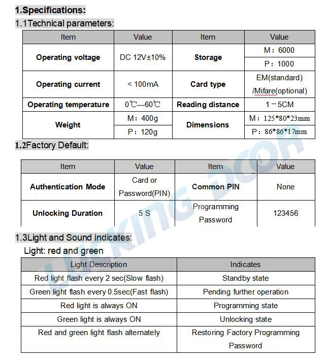 13.Compatible Cards: EM standard card (Can't support some encrypted cards,such as HID, Cobra, APCIK, etc)