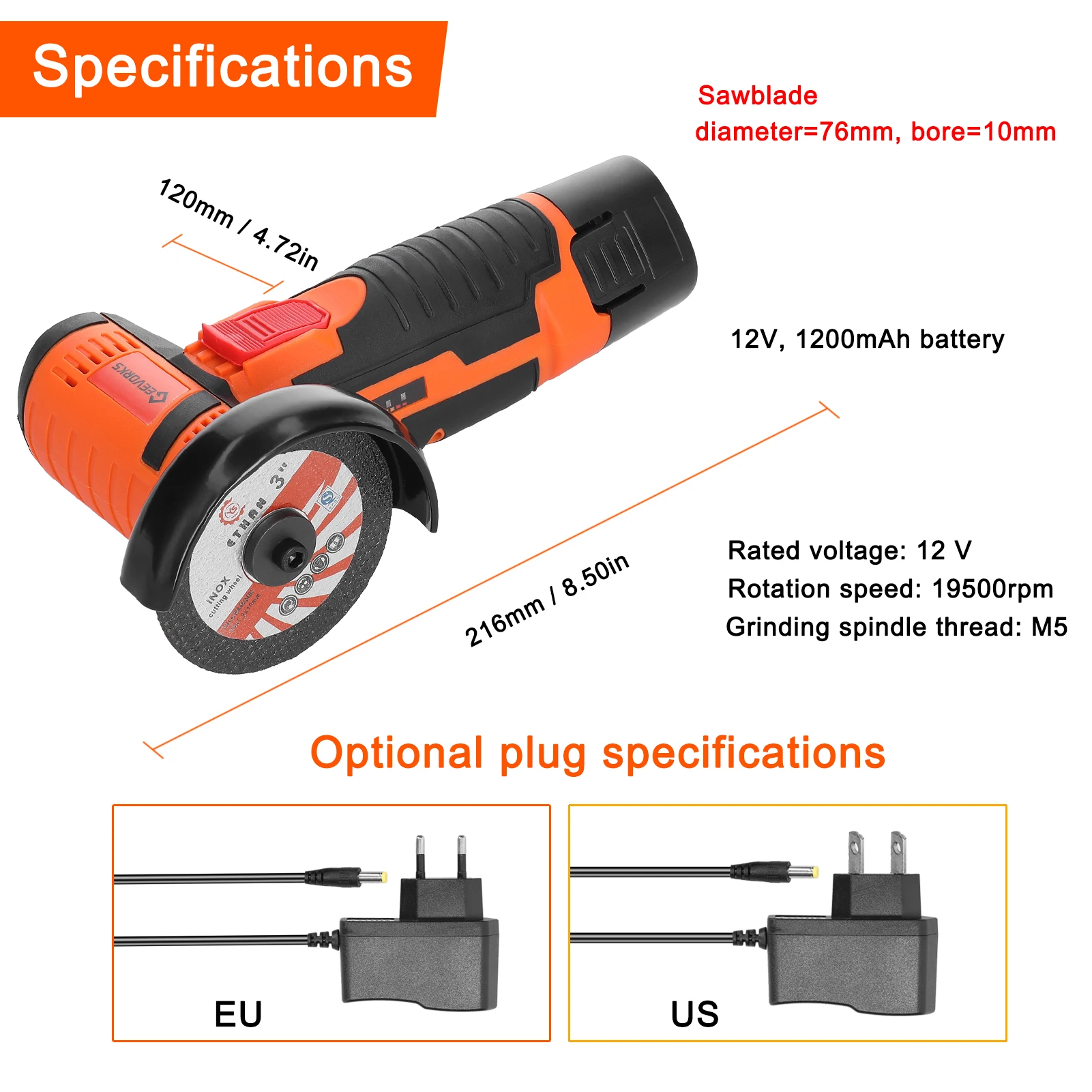 Sawblade: diameter=76mm, bore=10mm