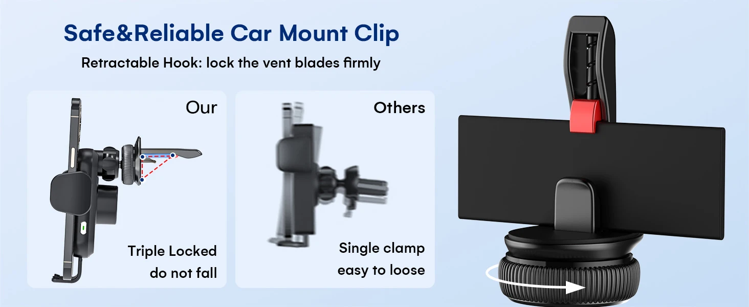 This vent mount clip with the latest fall-proof locking design ensures your car phone mount or GPS device stays on the vents securely. Even on bumpy roads, the car mount clip won't fall off. All these upgrades provide the most stable user experience.