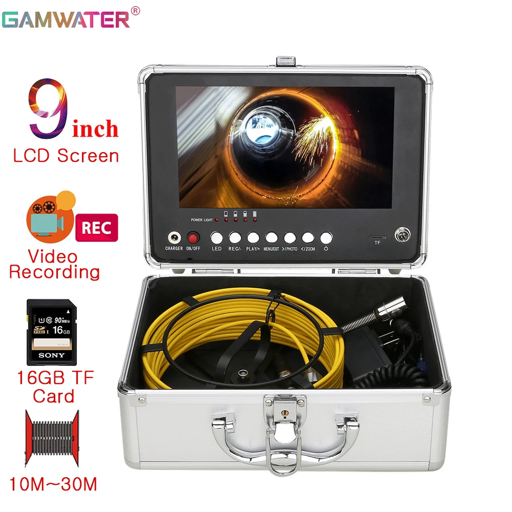 17MM Sewer Pipe Inspection Camera with DVR 16GB TF Card, Sewer Drain Industrial Endoscope 9" Monitor AHD 720P Camera System 10M