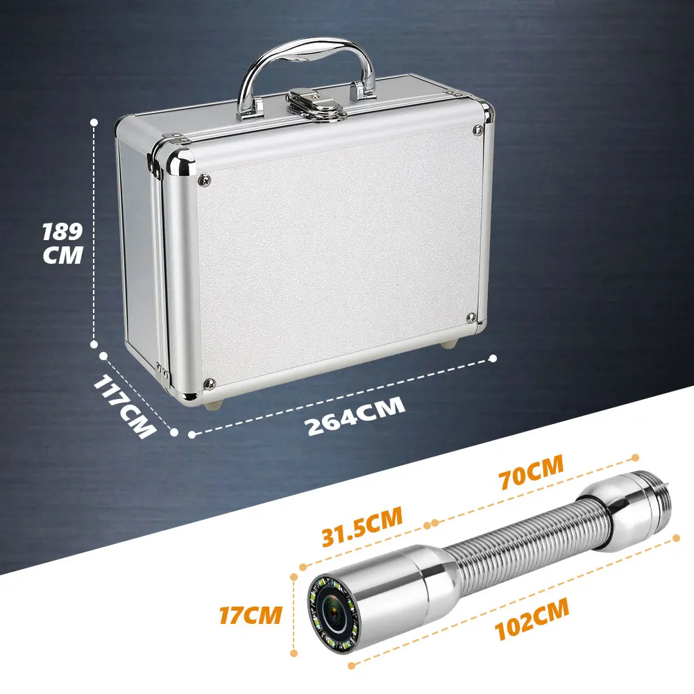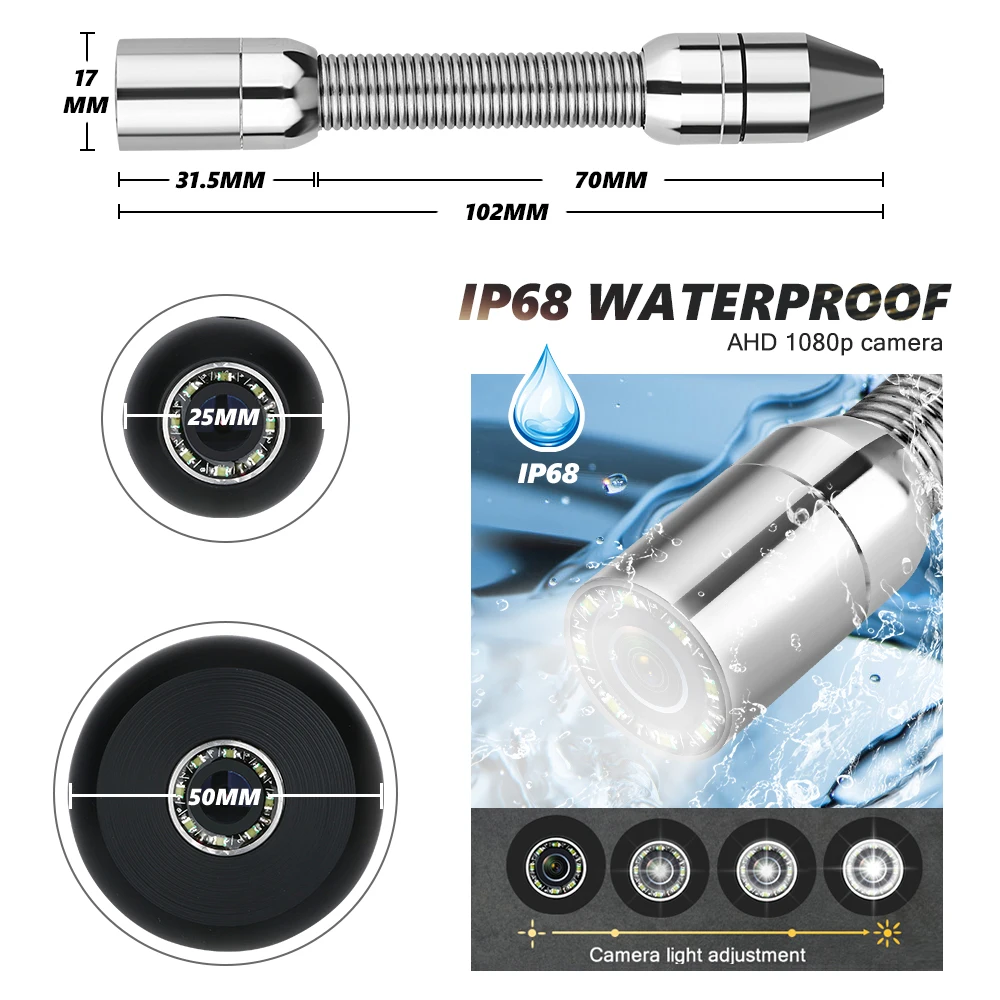 The Drain Sewer Pipeline Industrial Endoscope System with AHD 720P high-definition waterproof IP68 #304 stainless steel camera+tipped probe+90°wide viewing angle what make it clear when you inspect some places hard to watch.8 pcs adjustable LEDs to illuminate the hard-to-reach inspection area.Inspections will be seen more clearly in the dark environment.