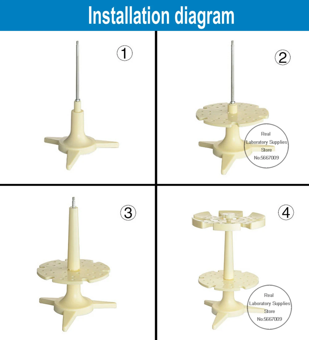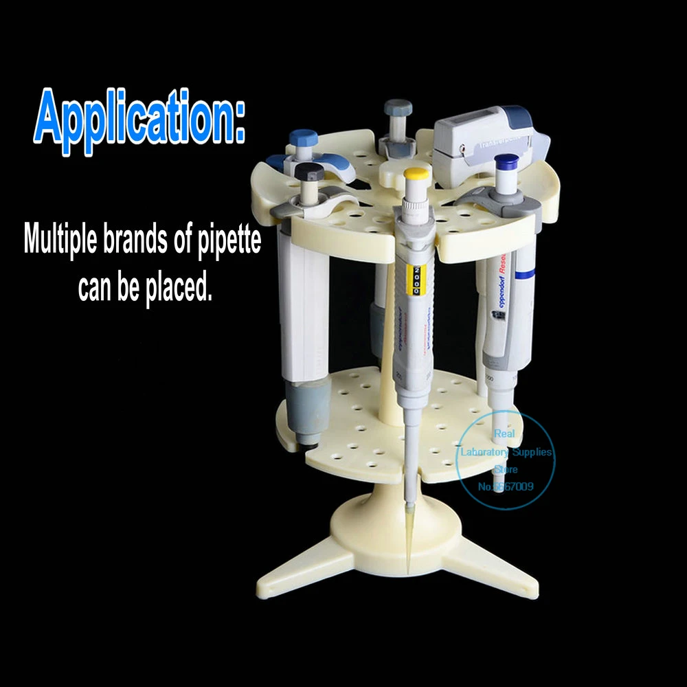 Item: pipettor rack Material: GPPS Polystyrene Type: 1) It can be assembled and rotated. 2) Can place 6 pipettors, and the middle holes can also place glass graduated pipettes. Qty: 1piece Note: The product is empty rack, not include any pipette or pipettor.