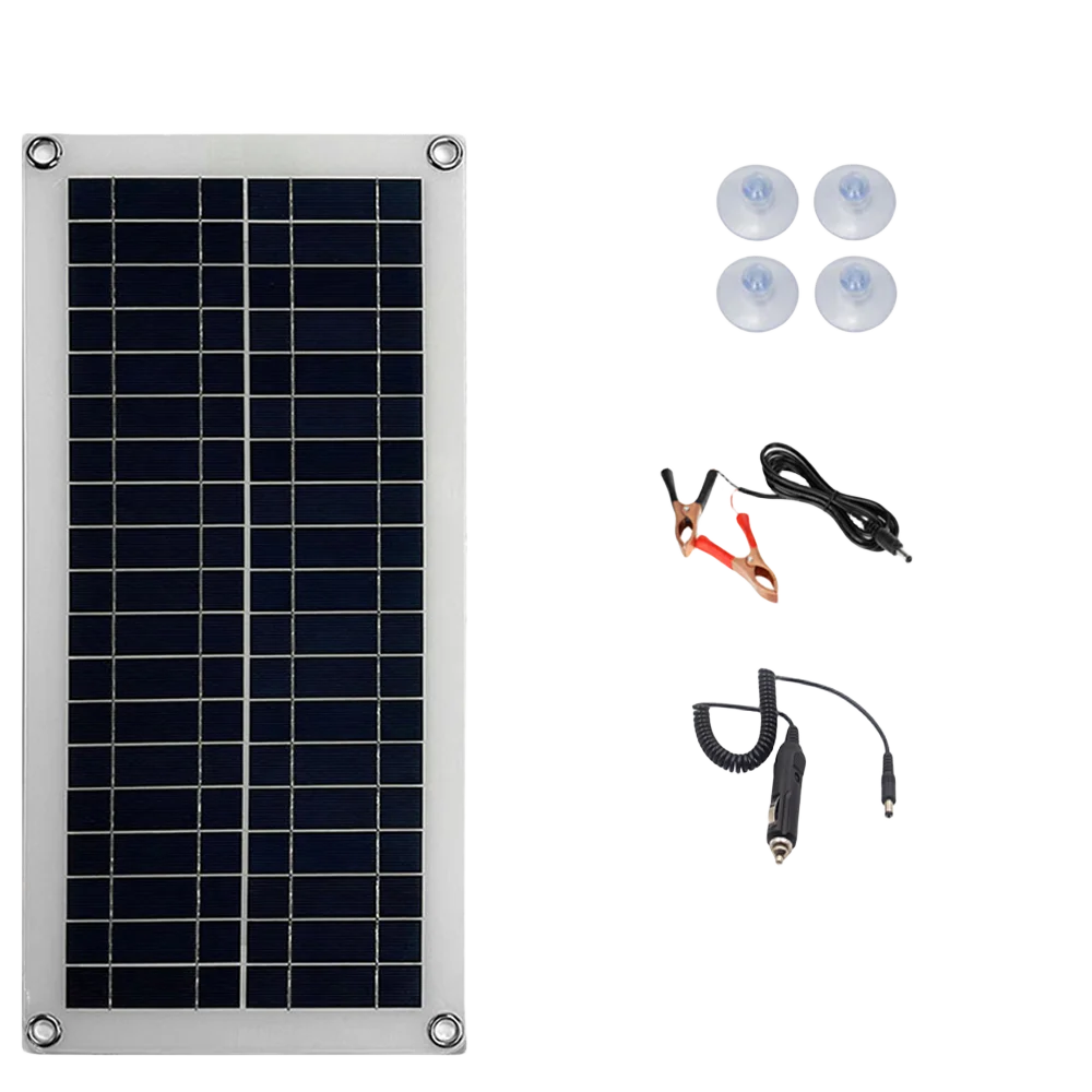 A solar panel: [1 * solar panel, 1 * car charger, 4 * suction cups, 1 * crocodile clip wire]