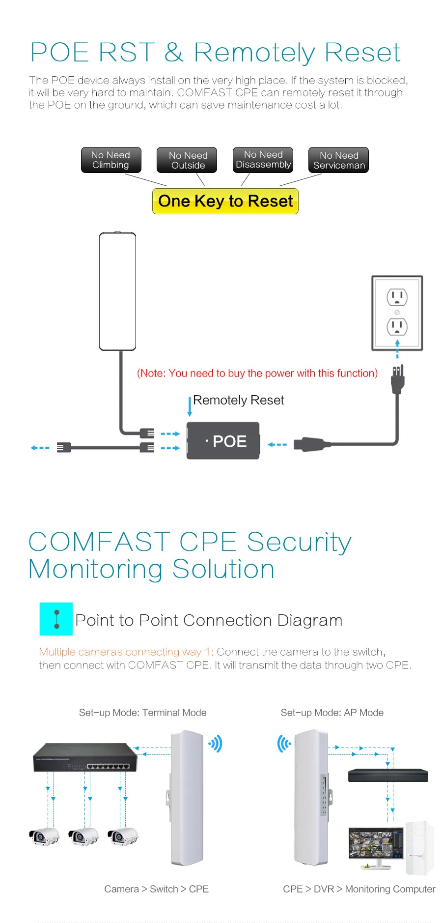 If the angle of camera and monitor center is less than 60degree,there canconsider one point to multi point connection.t can reduce CPEs with thetransmitting mode,which can save project cost a lot.Pls pay attention thatit has to meet the angle and Broadband requiement.