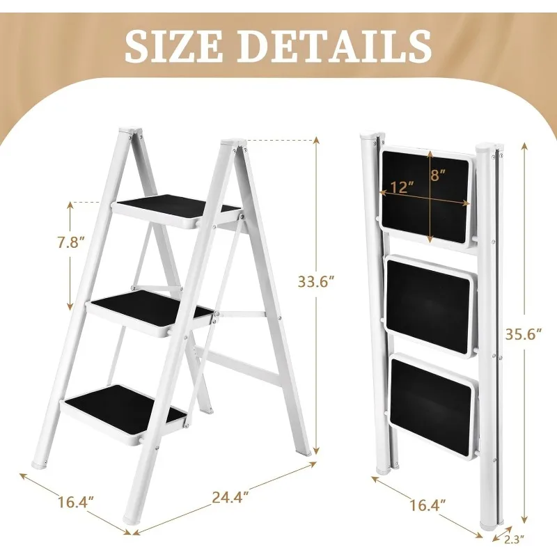 • 【SPACE SAVING】Save space with our 3-step ladder, folding down to a mere 2.3'' width, making it easy to store in tight corners, against walls, or under beds and cabinets.