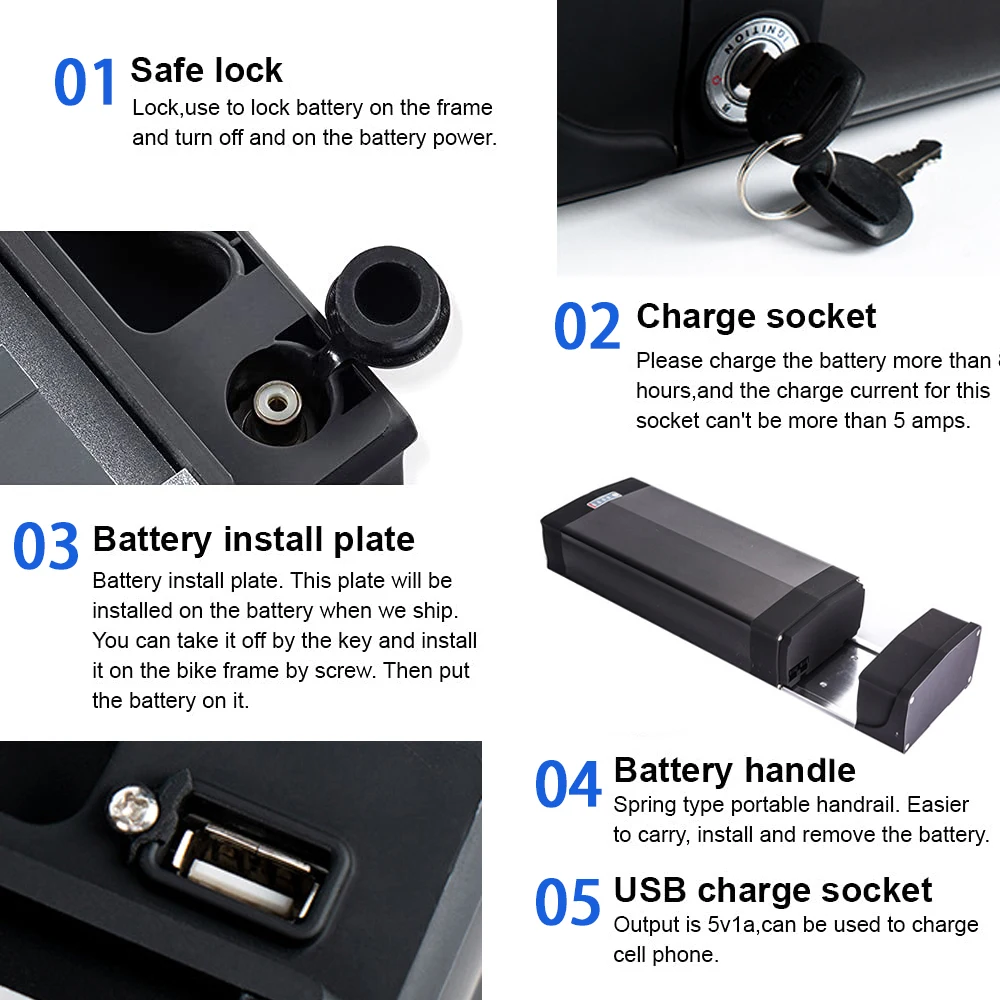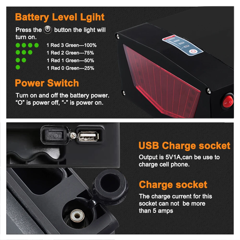 18650 Ebike Battery Rear Rack 36V 48V 52V 30Ah 20Ah Lithium Batteria for 24"- 28" Electric Bicycle 250W 350W 500W 750W 1000W