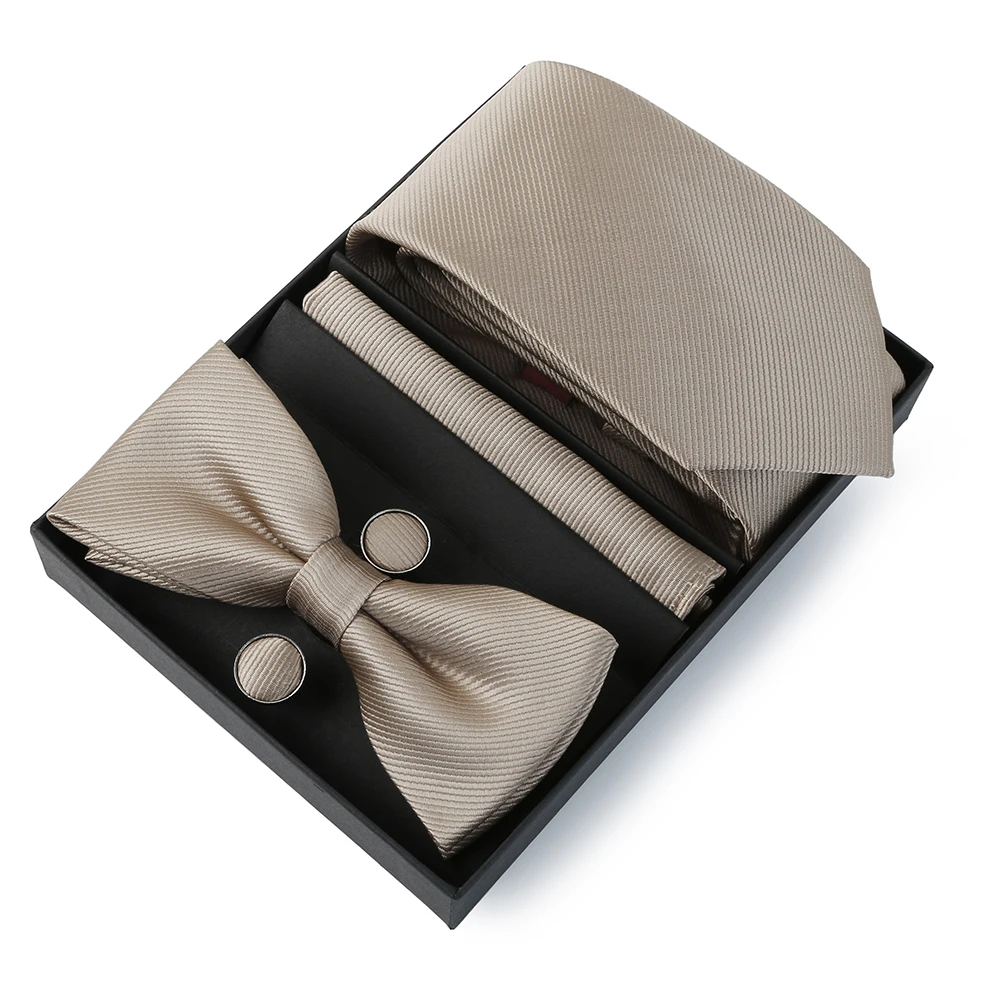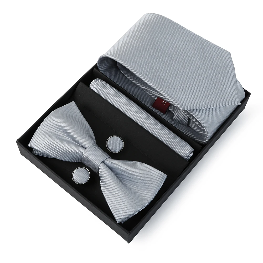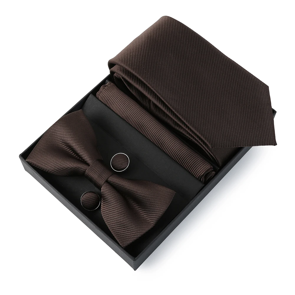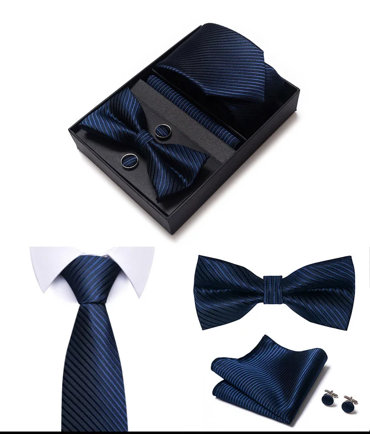 Set includes necktie, bowtie, pocket square, cufflinks, black gift box