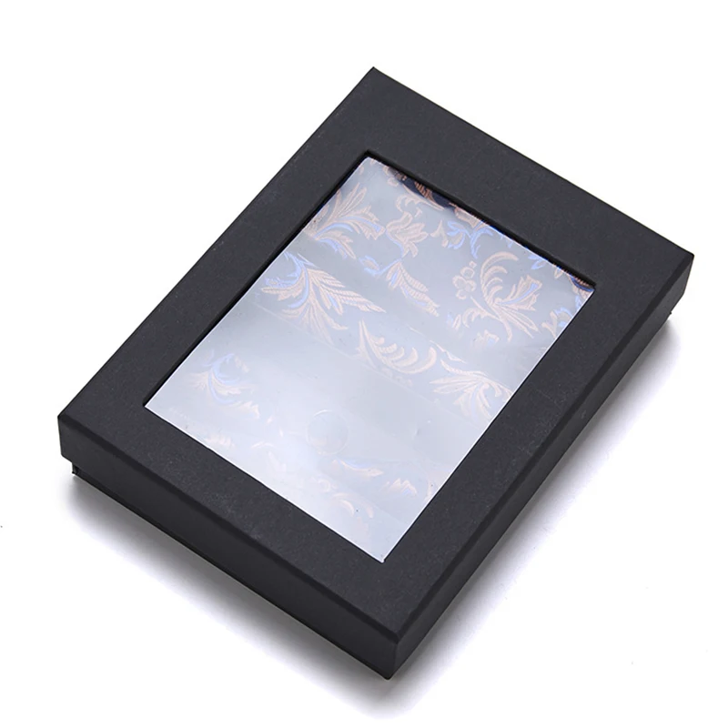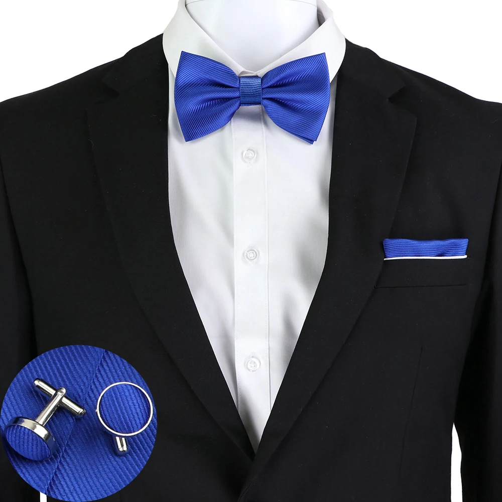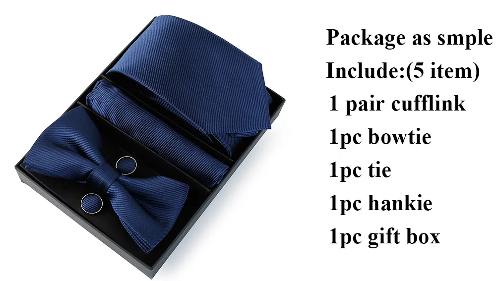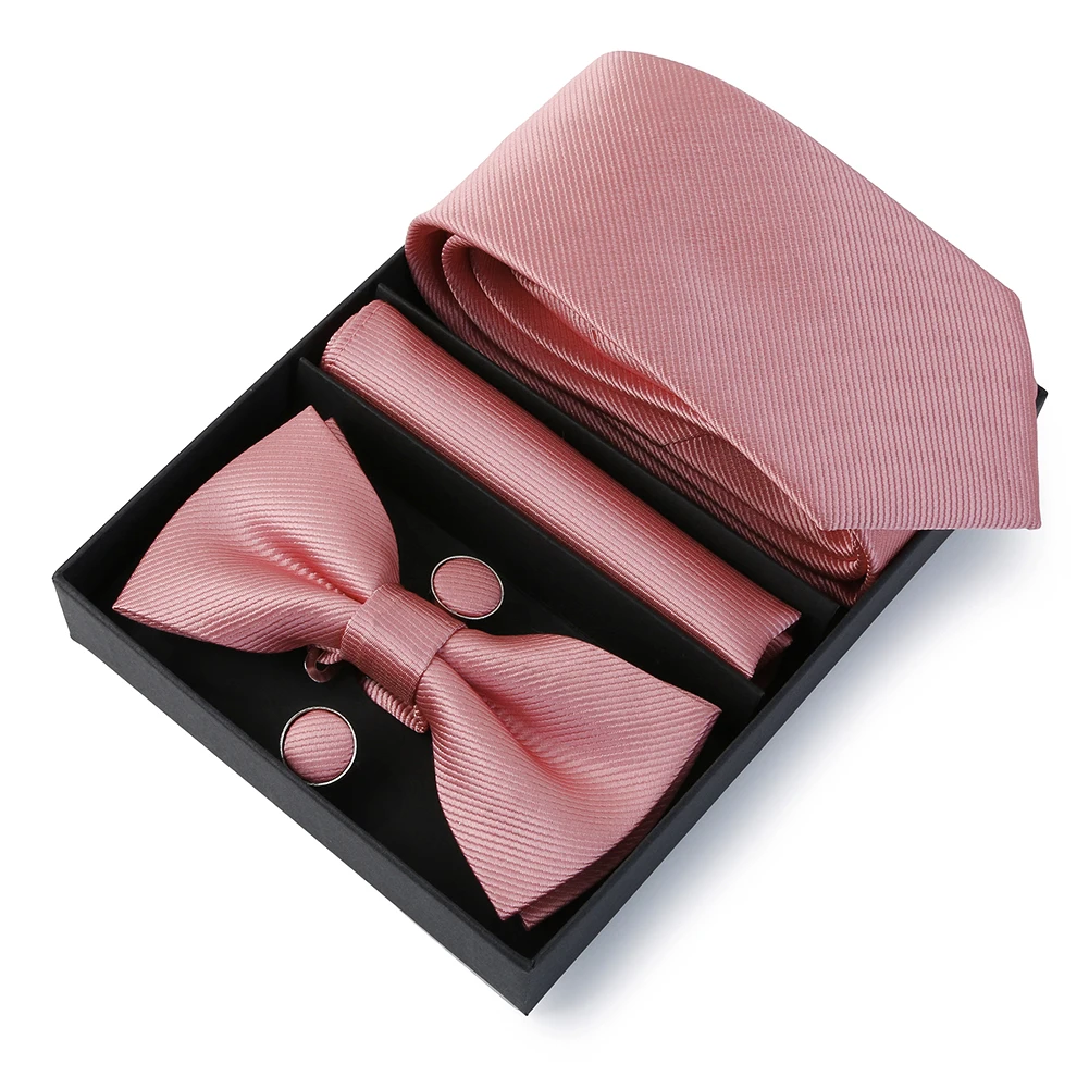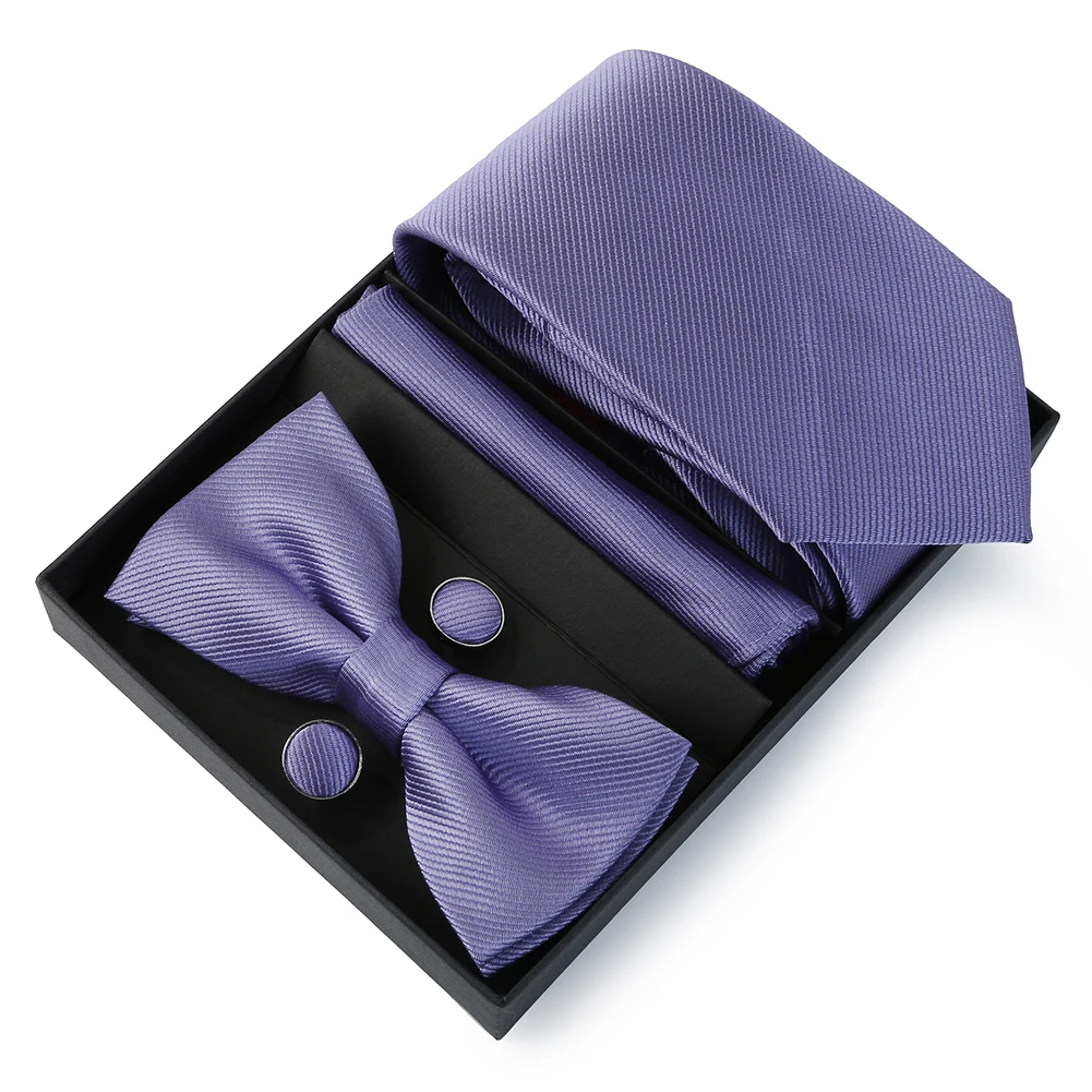 Set includes necktie, bowtie, pocket square, cufflinks, black gift box