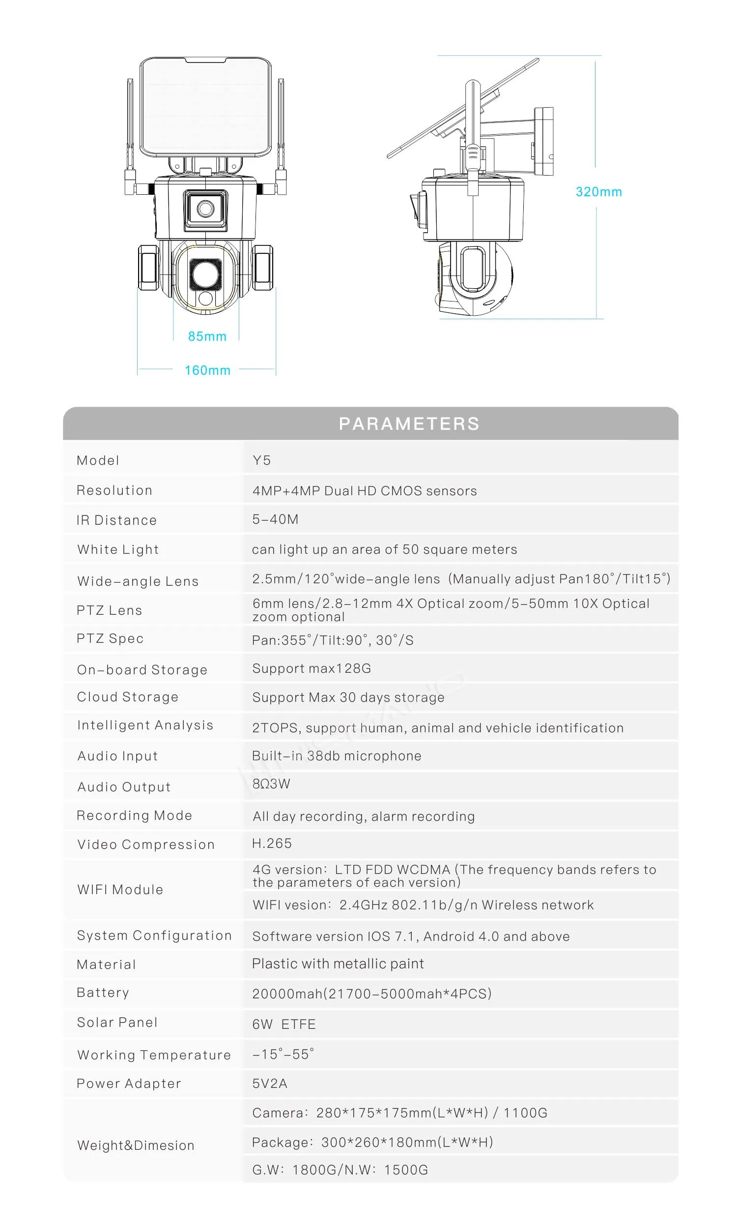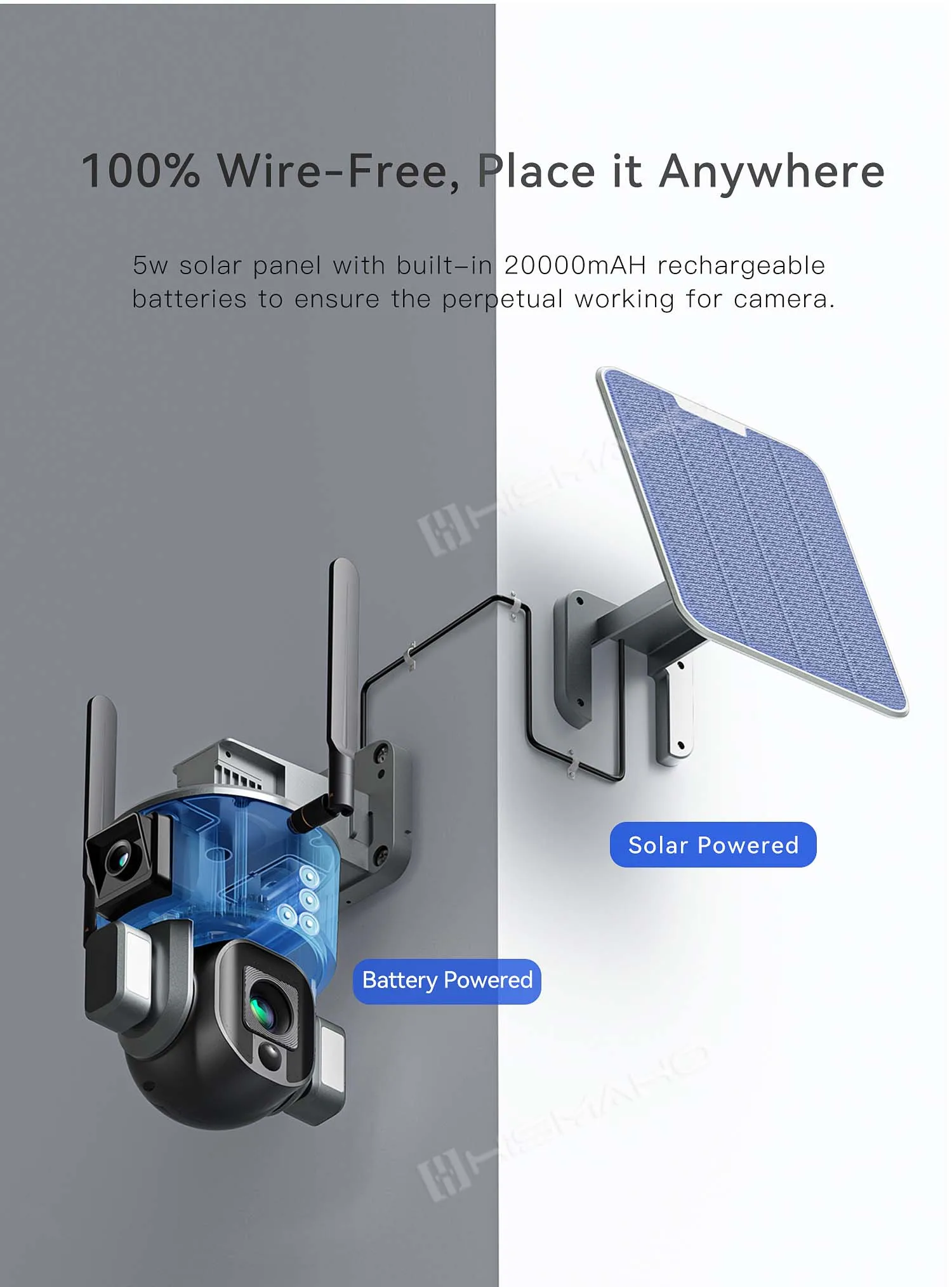 *5w solar panel with built-in 20000mAH rechargeable batteries to ensure the perpetual working for camera.