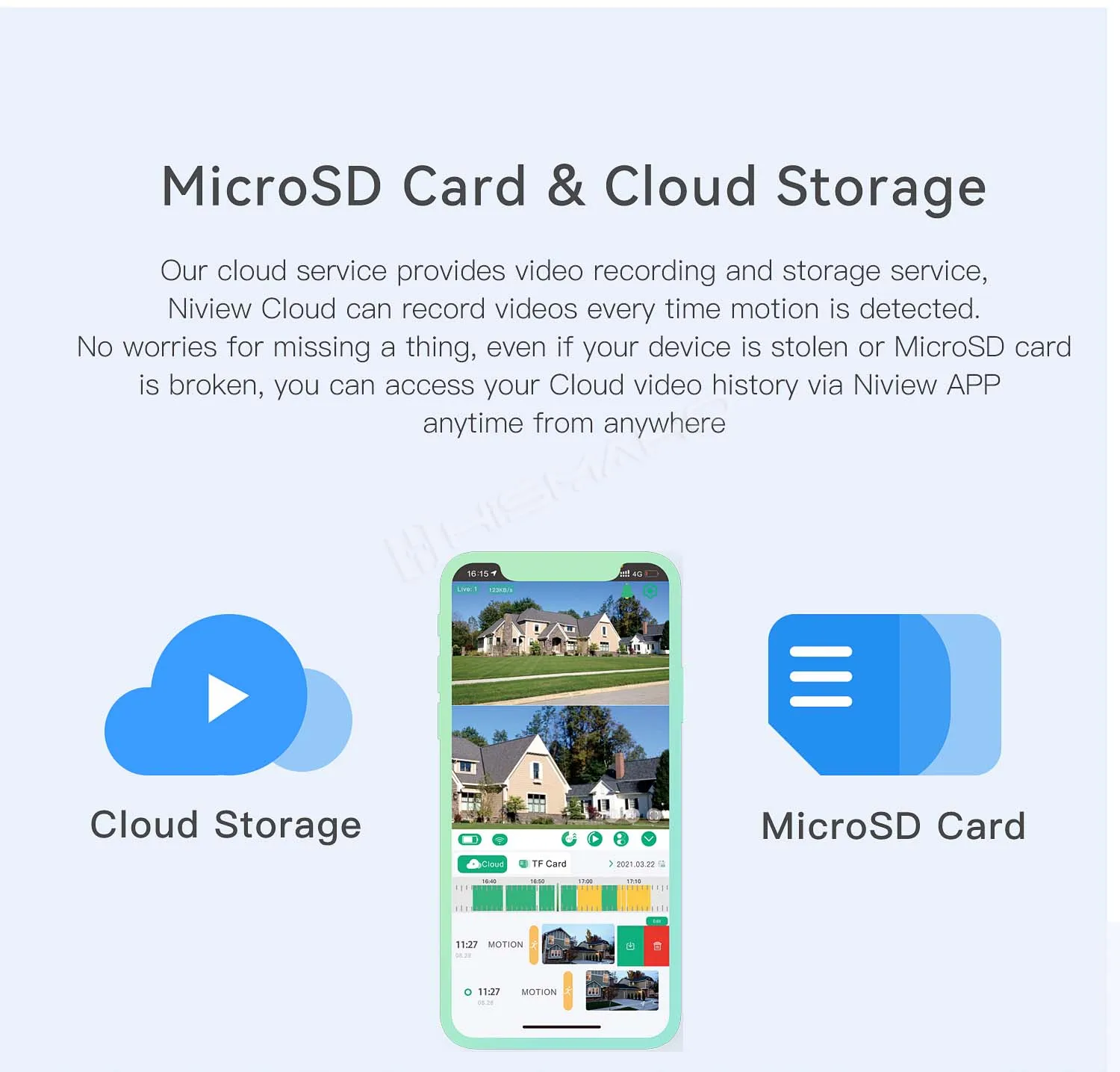 No worries for missing a thing,even if your device is stolen or MicroSD card is broken,you can access your Cloud video history via Niview APP anytime from anywhere.