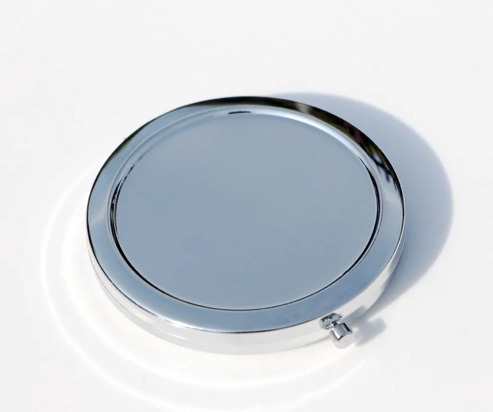 Silver metal round compact mirror blank, perfect for creating super cute DIY decoden masterpieces! A good quality product with double mirror with a push button opening and snap-shut design.Perfect for keeping in your handbag. It has a blank surface to the top which is great for decoden, but also for engraving. Size is approx. 69mm in diameter.