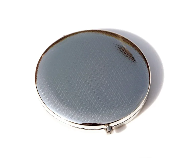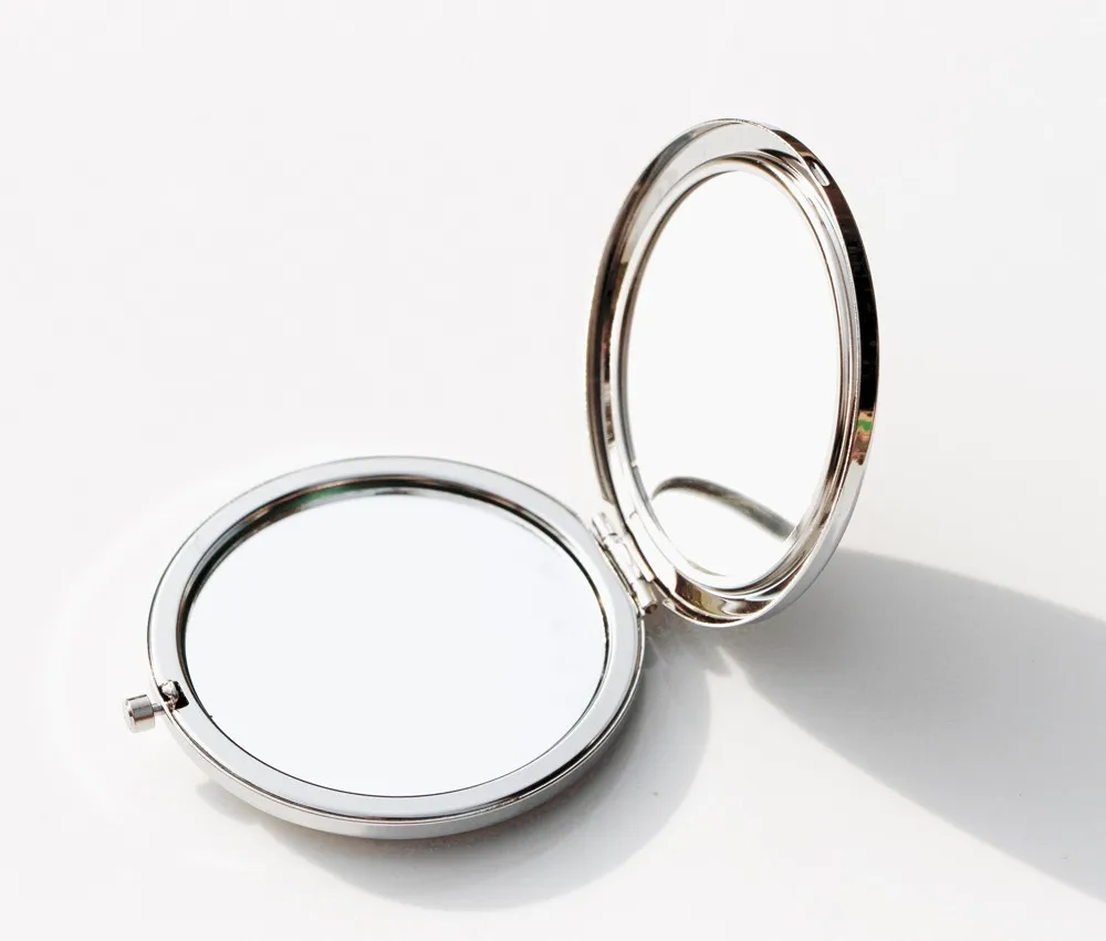 Silver metal round compact mirror blank, perfect for creating super cute DIY decoden masterpieces! A good quality product with double mirror with a push button opening and snap-shut design.Perfect for keeping in your handbag. It has a blank surface to the top which is great for decoden, but also for engraving. Size is approx. 69mm in diameter.