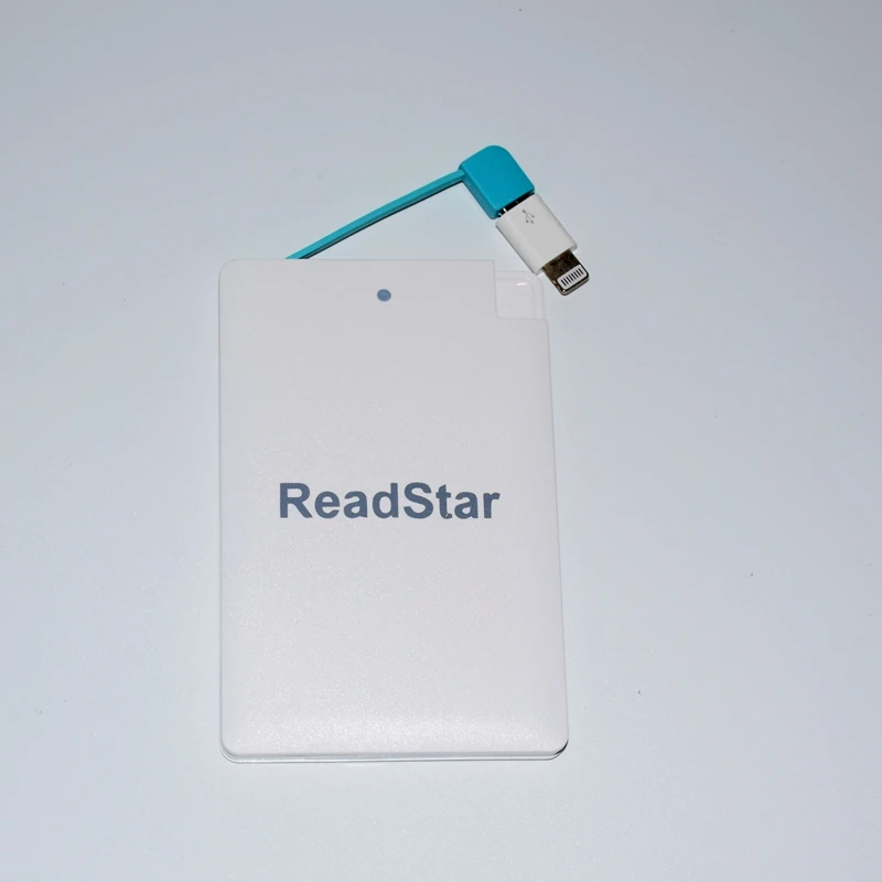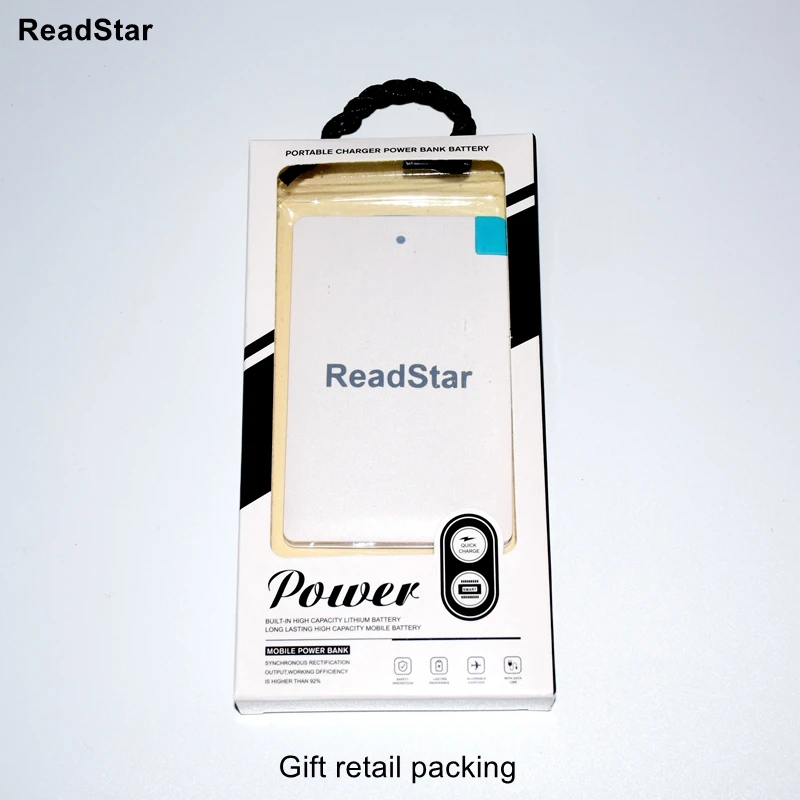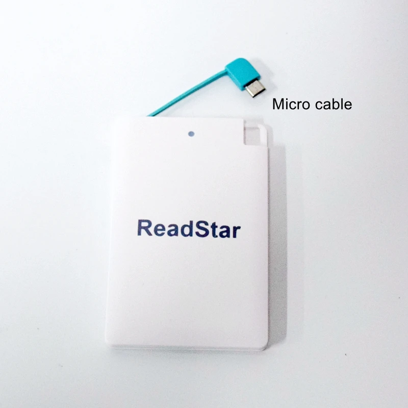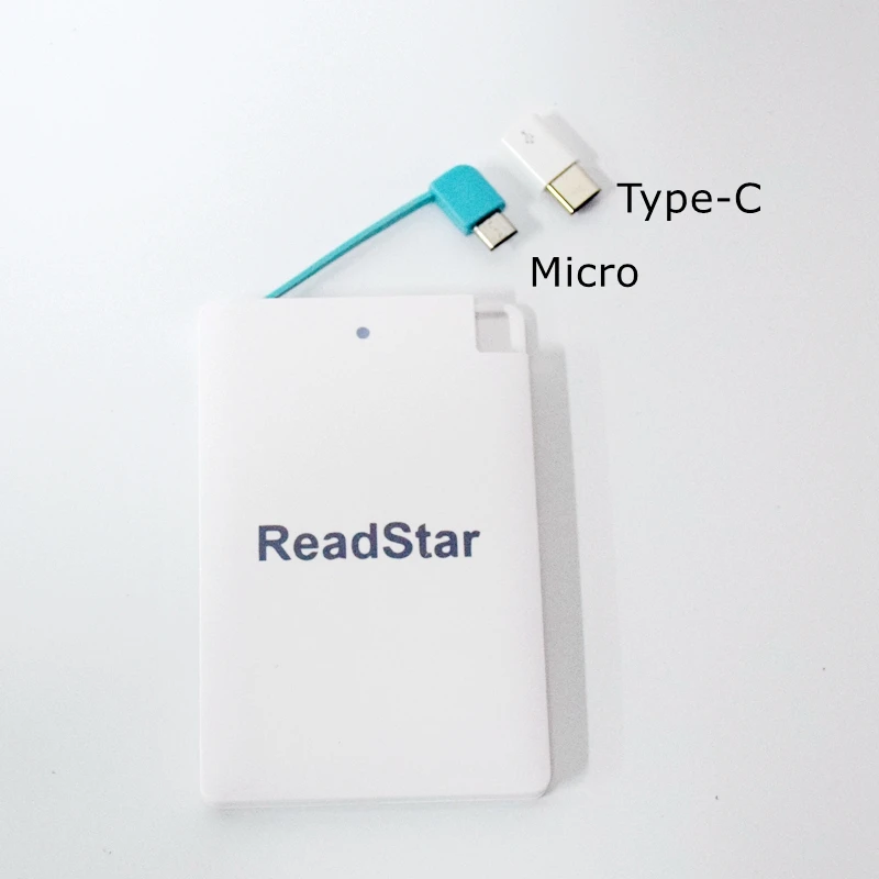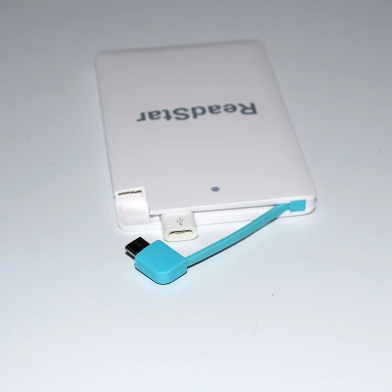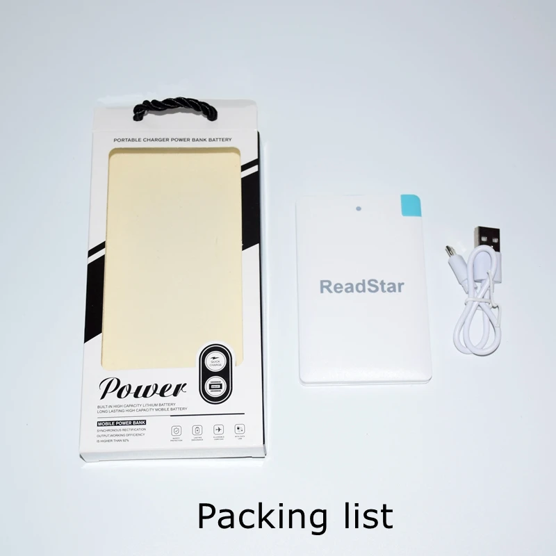 Description Description ReadStar Credit card Mini Power bankCapacity:2500mAhSize:96x62x8.3mmNet weight:about 61gAdapter:Micro USB(add Type-C & Apple adapter available)Color:White/BlackCustomize Logo available(Min. Quantity 50 Pieces) View AllClose