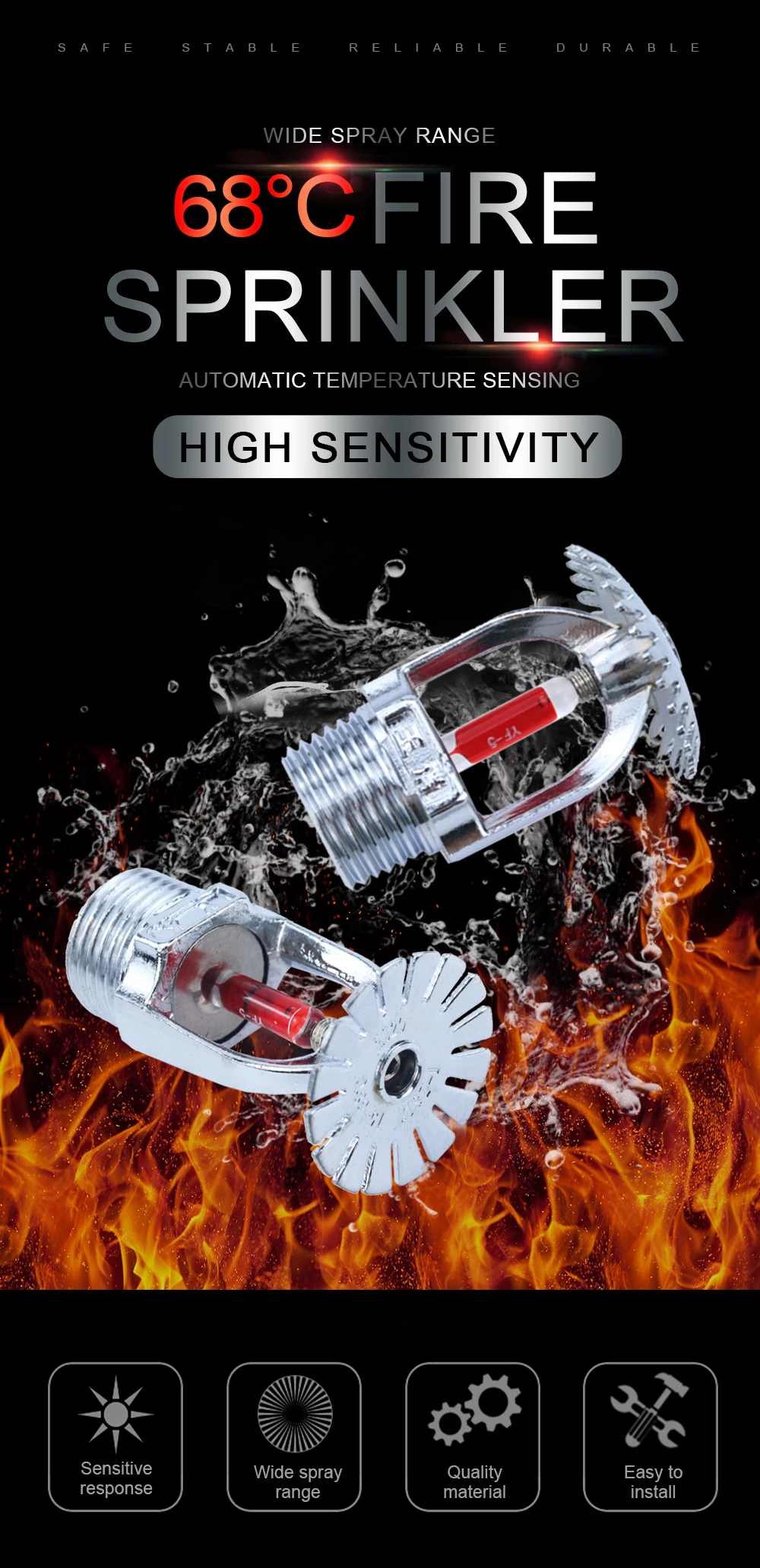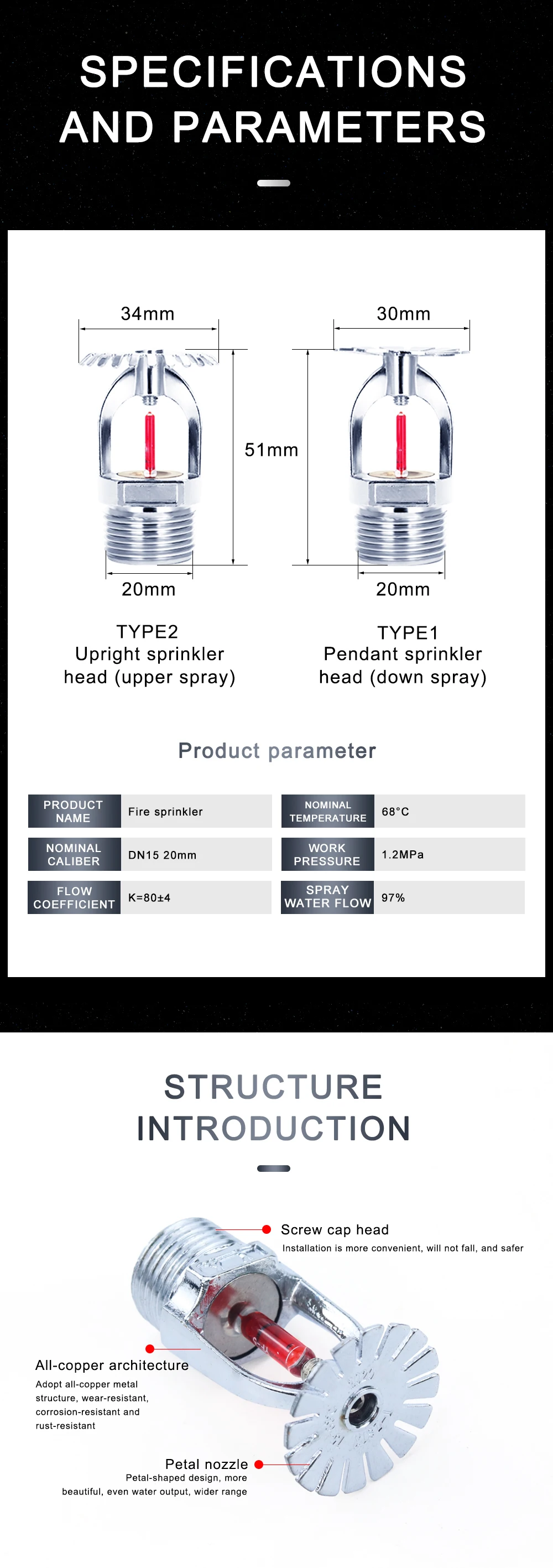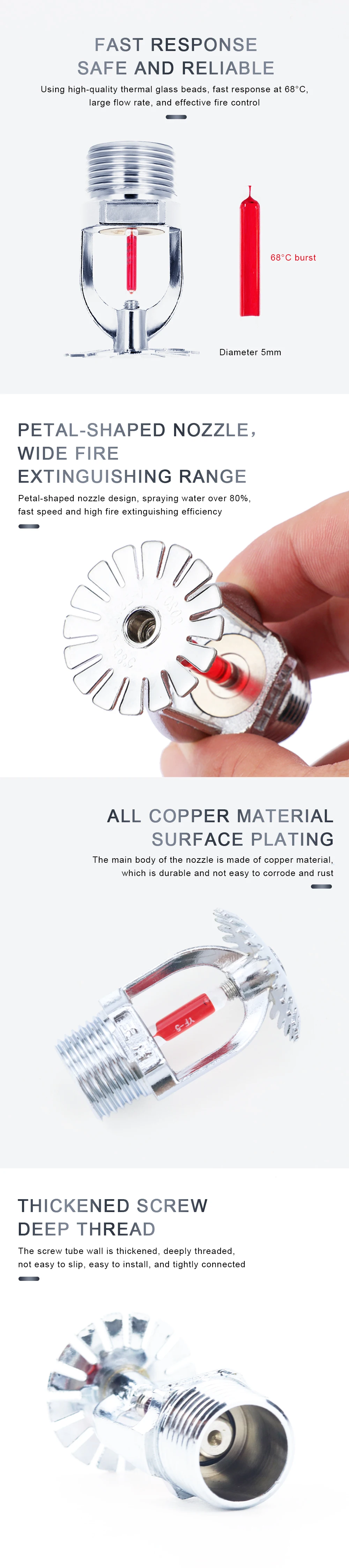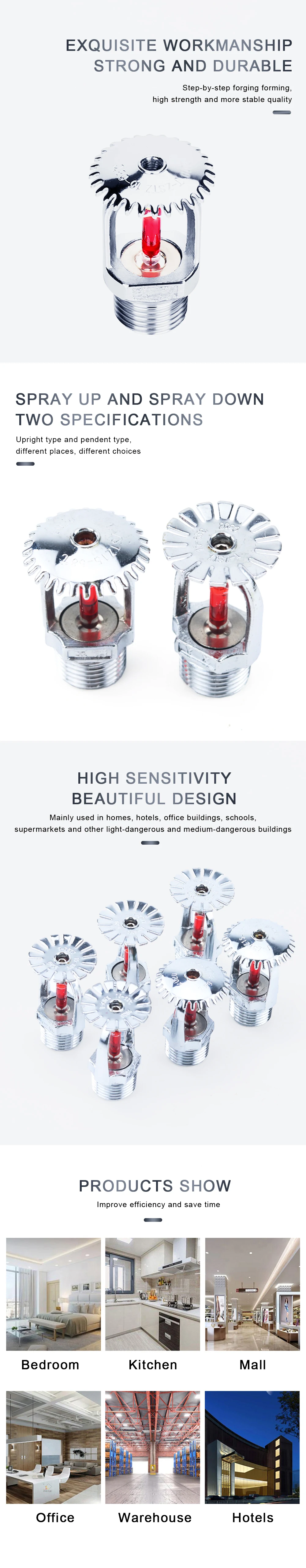 1.Sprinklers assembled from copper alloy frame, glass balls and seals with compact shape and delicate appearance.