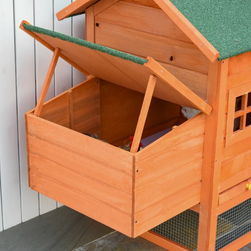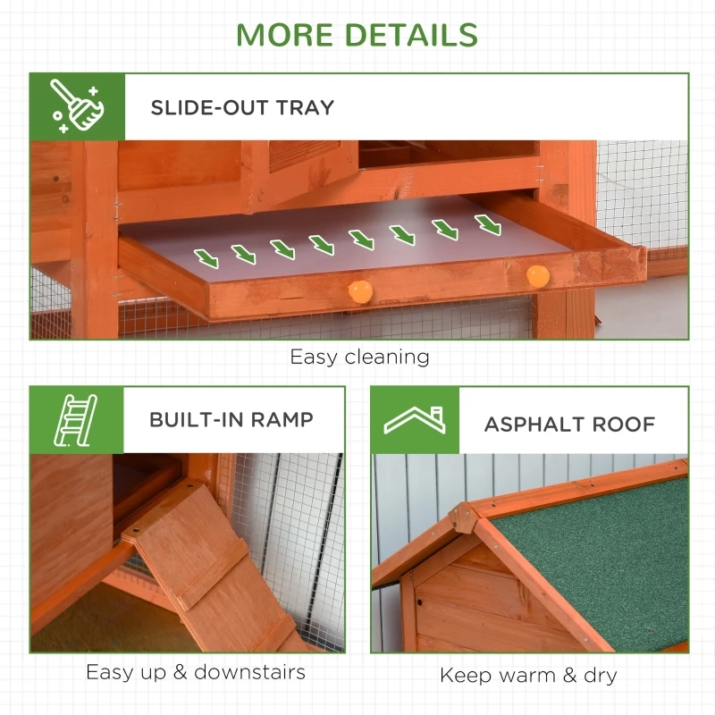 Give your feathered friends a comfortable living space with this chicken coop from PawHut! Our wooden chicken coop has a spacious area to provide ample space for your pet to rest and explore. This chicken cage includes lockable doors to keep safe and secure. The chicken enclosure is made with a solid fir wood frame and an asphalt roof, making the structure suitable for outdoor use. Open the roof to provide air circulation and easily collect eggs. Slide-out tray for easy and quick cleaning.