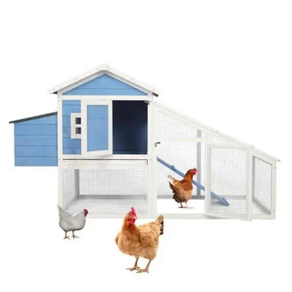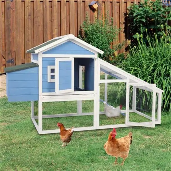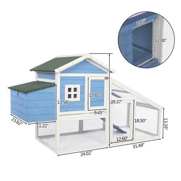 This quality 69" Wooden Chicken hutch provides a large cozy place for keeping poultry, especially chicken. It features multiple uses: playing, exercising, training, hatch,or simply keeping your poultry safely.This chicken hutch provides your chicken with plenty of exercise space while the tight iron wire mesh helps prevent mischievous behaviors and unexpected accidents. Meanwhile, the construction of iron wire grid ensures your monitoring of the chicken and enables your chicken to keep an eye on the surroundings and get enough fresh air.The chicken hutch is built with a high-quality wood frame, making it a strong and safe enclosure that lasts for years. Its green roof keeps rain away while the cozy cubby makes the perfect sleeping area. An easy-climb ladder leads from the lower ground level to the upper floor. A pull-out tray makes cleaning easy. And the doors close easily and lock with slide-bolt latches.This spacious wooden chicken hutch is perfect for 3-5 chicken .If you are not good at installing, do not worry, this hutch is easy to assemble with included instructions and hardware.