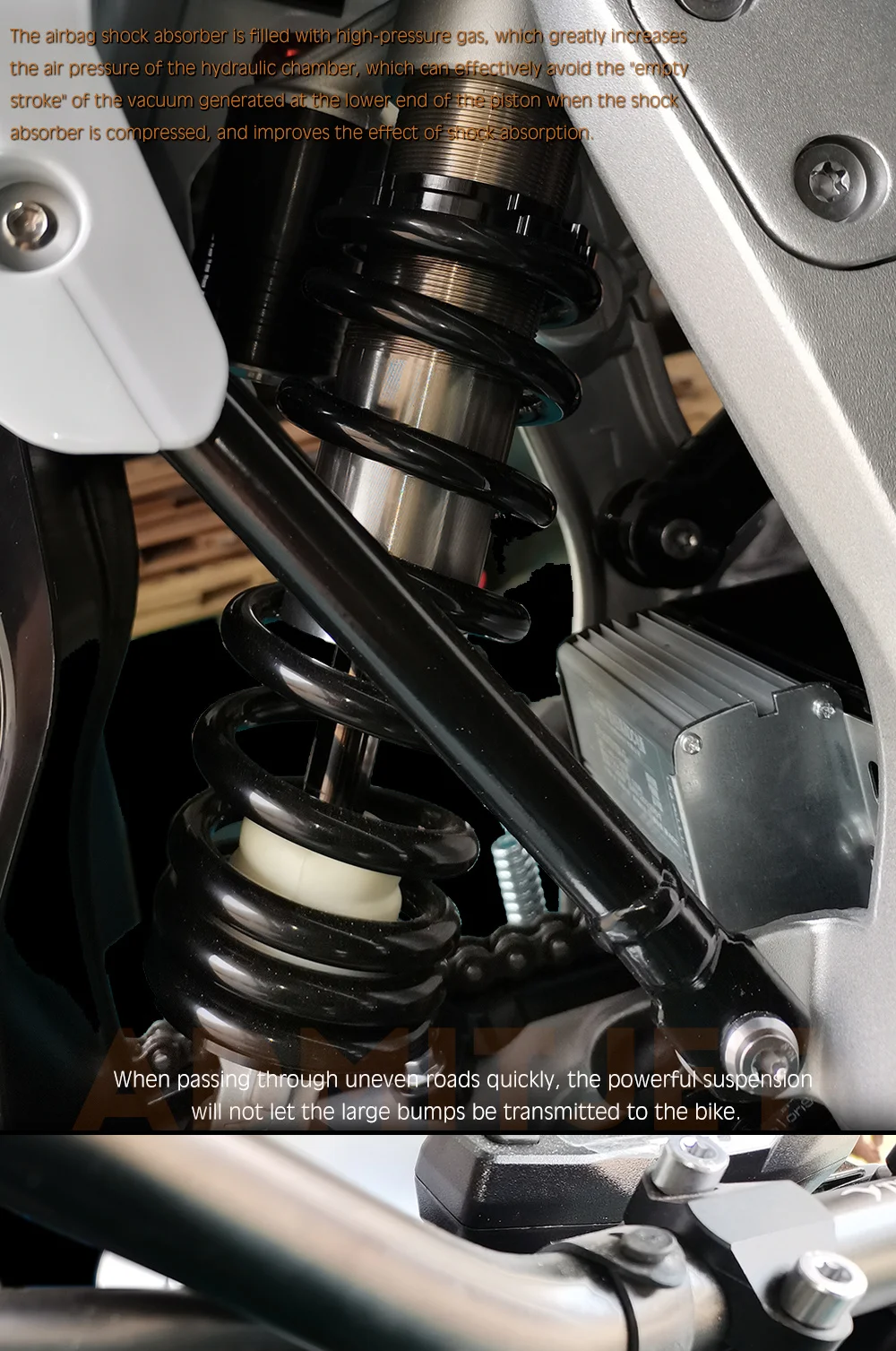 Safety is a top priority for AdmitJet, and the Armor is no exception. The bike features a single-chamber dual-adjustable F&R absorber that provides excellent shock absorption and stability. The front and rear brakes are both disc brakes, providing reliable stopping power even at high speeds.