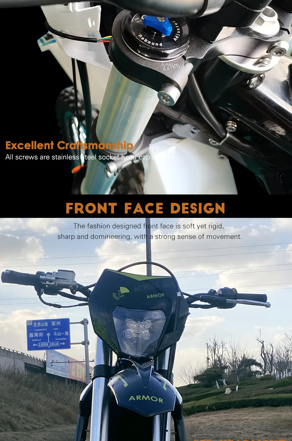 The AdmitJet Armor is a true artisan electric motorcycle. Its frame is made of metal Q345b and 6061 forge aluminium alloy, which is both lightweight and durable. The rear fork is made of aluminium alloy, and the driven chain and sprocket are made of high-strength steel. The Armor's handbar, steering, brake, and clutch lever are made of aluminium alloy 7075, which is both lightweight and strong. The bike's LED lights provide excellent visibility at night, and the LCD meter display provides real-time information about the bike's performance.