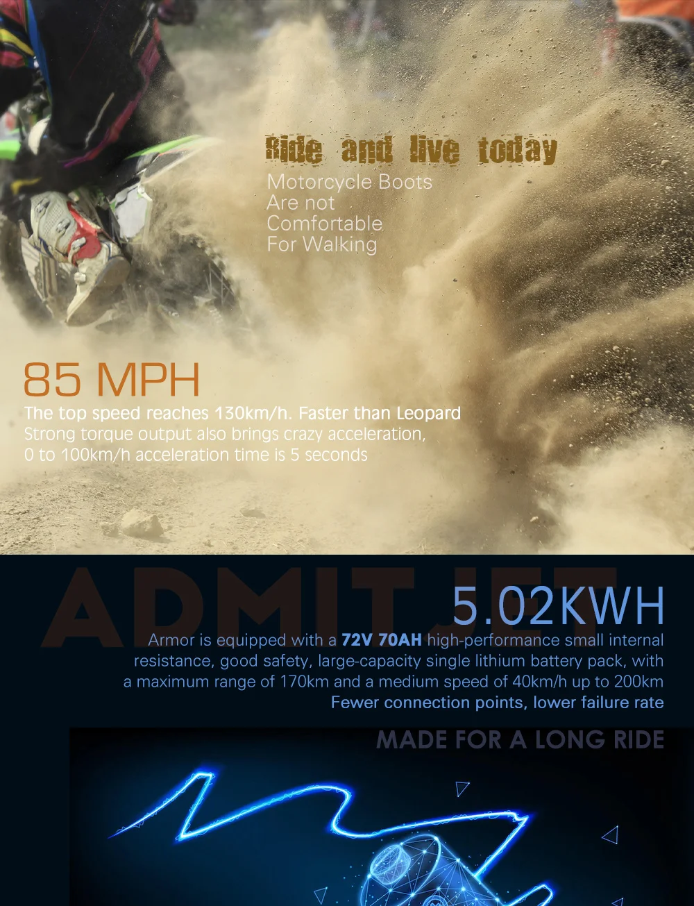 The AdmitJet Armor boasts an impressive 3000W DC E-Power motor, which delivers a maximum power output of 20000W. It has a top speed of 130 km/h (85 mph), which is faster than many other electric motorcycles on the market. The Armor has 0-1-2-3-4 forward gears, which allow riders to adjust the power and speed to suit their preferences. The lithium battery has a peak output current of 300Ah and a continuous output current of 150Ah, providing a range of up to 105 miles per charge. The battery can be fully charged in as little as one hour with a 10Ah charger.