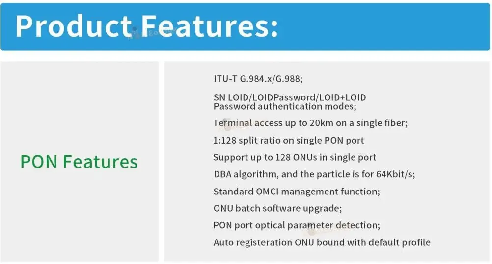 Add to Cart Quick view 8 GPON PORT GPON OLT with 1:128 MAX Splitting Ratio 8 PON PORT GPON OLT FOR FTTH 1000BASE-C+/C++ GPON(2.5G)+10GUPLINK $3,206.63 8 PON PORT GPON OLT with 1:128 MAX Splitting Ratio 8 PON PORT GPON OLT FOR FTTH 8 GPON OLT provides