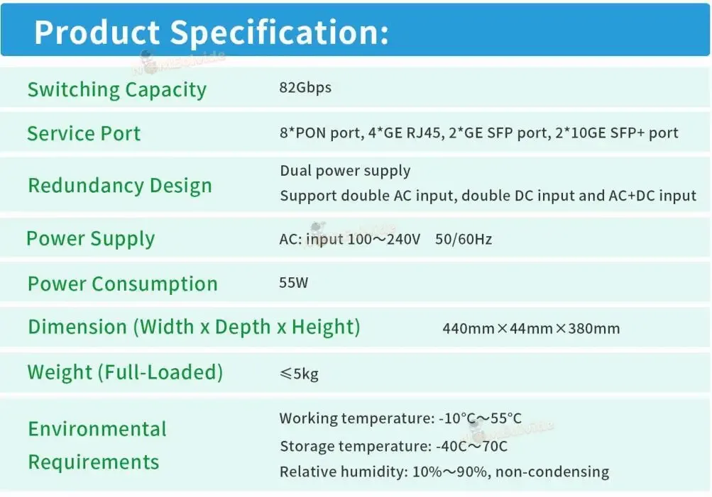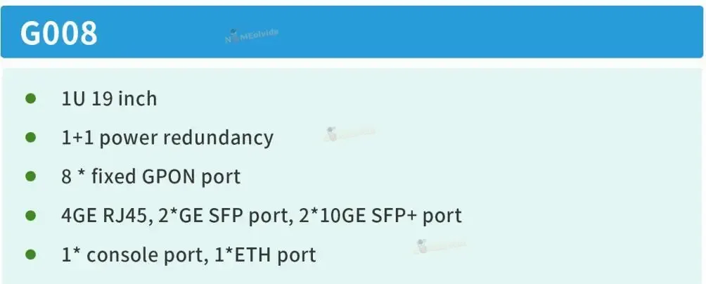 Description Description 8 GPON OLT 4 GE RJ45 ports, 2SFP ports, 2SFP+(10GE) optical uplink ports, 8 pon ports GPON OLT 4 SFP+ compatible View AllClose