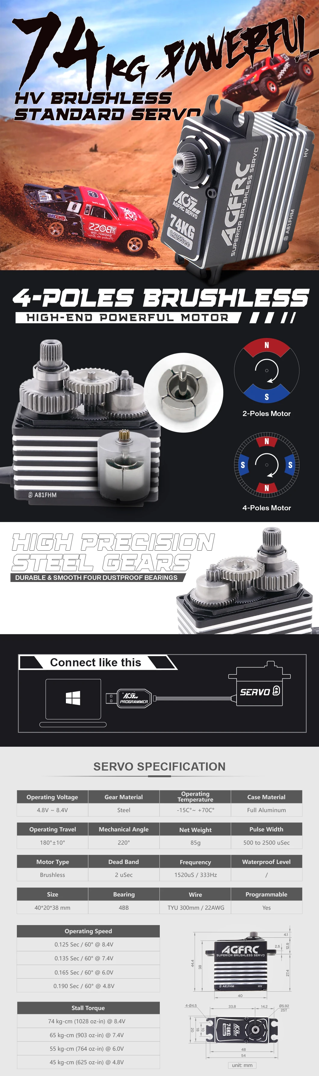 AGFRC A81FHM 74KG Super Torque HV 4-Poles Brushless Motor Programmable Digital Servo For 1/8 RC Car Truck Airplane, Buggy, Boat, Jet, Helicopter, Robotic Arm, ect.