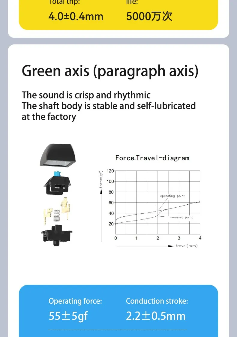 ⑵The yellow switch is a linear switch with no step feeling, touches the bottom vertically, feels light, comes with factory lubrication, pressure: 45±10g