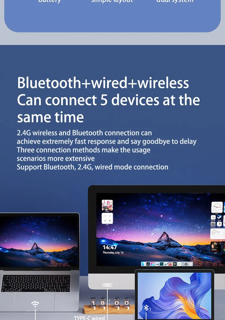 6. Connection method: Bluetooth/wired/wireless 2.4G. According to your usage habits, switch the connection method at will.