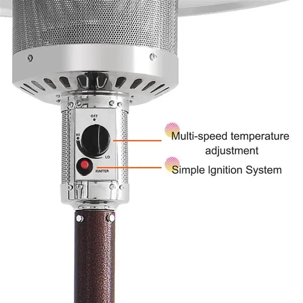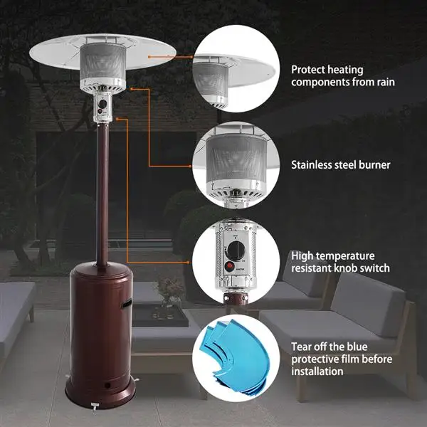 5.【HIGH QUALITY MATERIAL:】 The patio heater use high quality stainless steel of the heating element which isn't easy to melt/burn off, and the outdoor heater fire can't come through the grating and melted the rim, the gas patio heater has ETL certification, which can make sure the quality is excellent. Please pay attention that use the heater outside