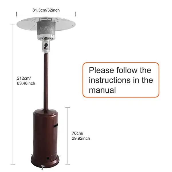 4.【SAFTY:】 The patio heaters use 20 lbs LP Gas tank and which add weight to the Base of the gas patio heater providing much needed stability and safety during windy conditions, also you can fix the outdoor heater base on the deck by screws, The patio heater has Safety auto shut off tilt valve and Safety auto shut off when the gas run out. It is tall enough to be safe from hair lighting