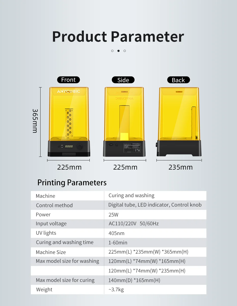 The unit can hold up to 14.9 liters (15.7 qts.), surpassing the sizes of most wash & cure machines in the market. The impressive maximum cleaning size of 300*165*300mm (11.8”x 6.5” x 11.8”) , is compatible with almost every consumer-grade resin 3D printer measuring 13.6”(35 cm) and below available on the market.