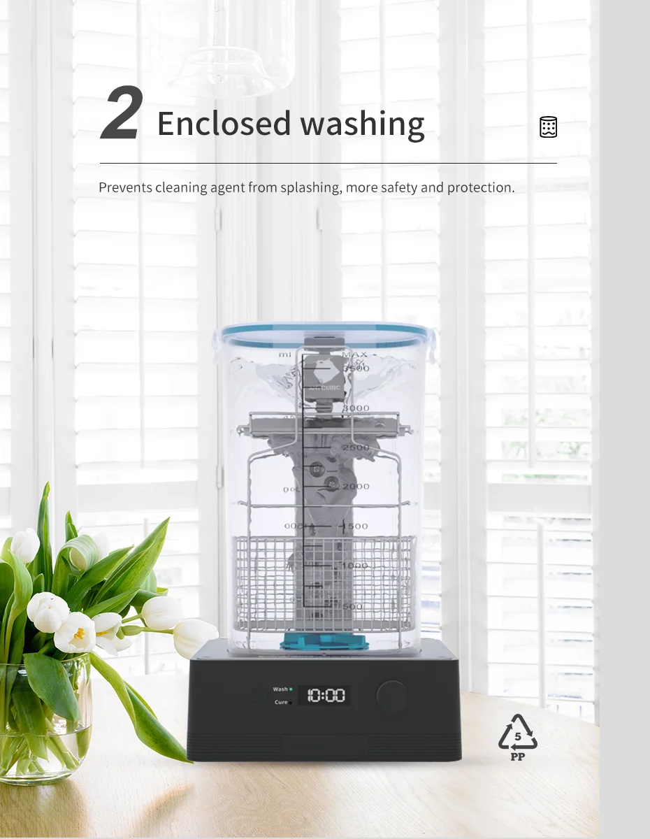 The washing bucket can accommodate larger size models and is compatible with all LCD resin printers of 8.9-inch and below on the market. Enclosed washing can prevent liquid splashing and volatilization, which is safer and more reliable.