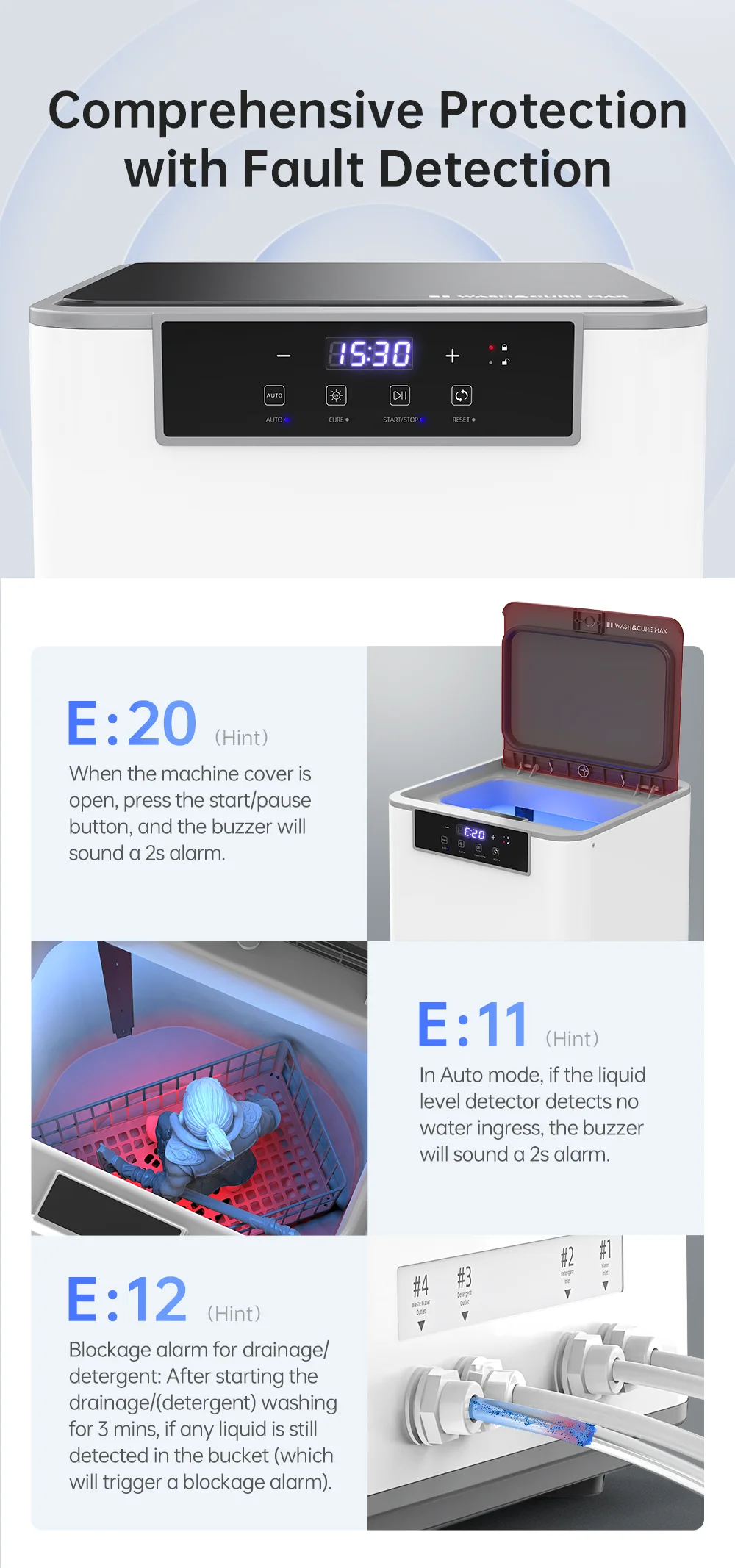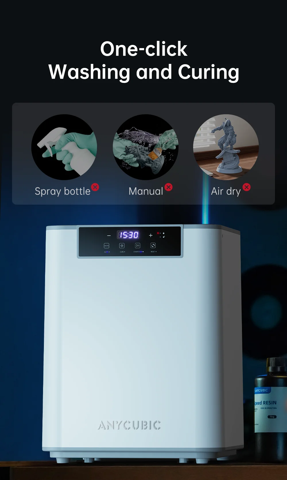 The adoption of two brand-new modes of spray rinsing and detail dipping ensures efficient and thorough cleaning. Powerful mechanical injection eliminates residual resin on the print surface, while the bottom dipping rinse effectively removes resin from intricate details.