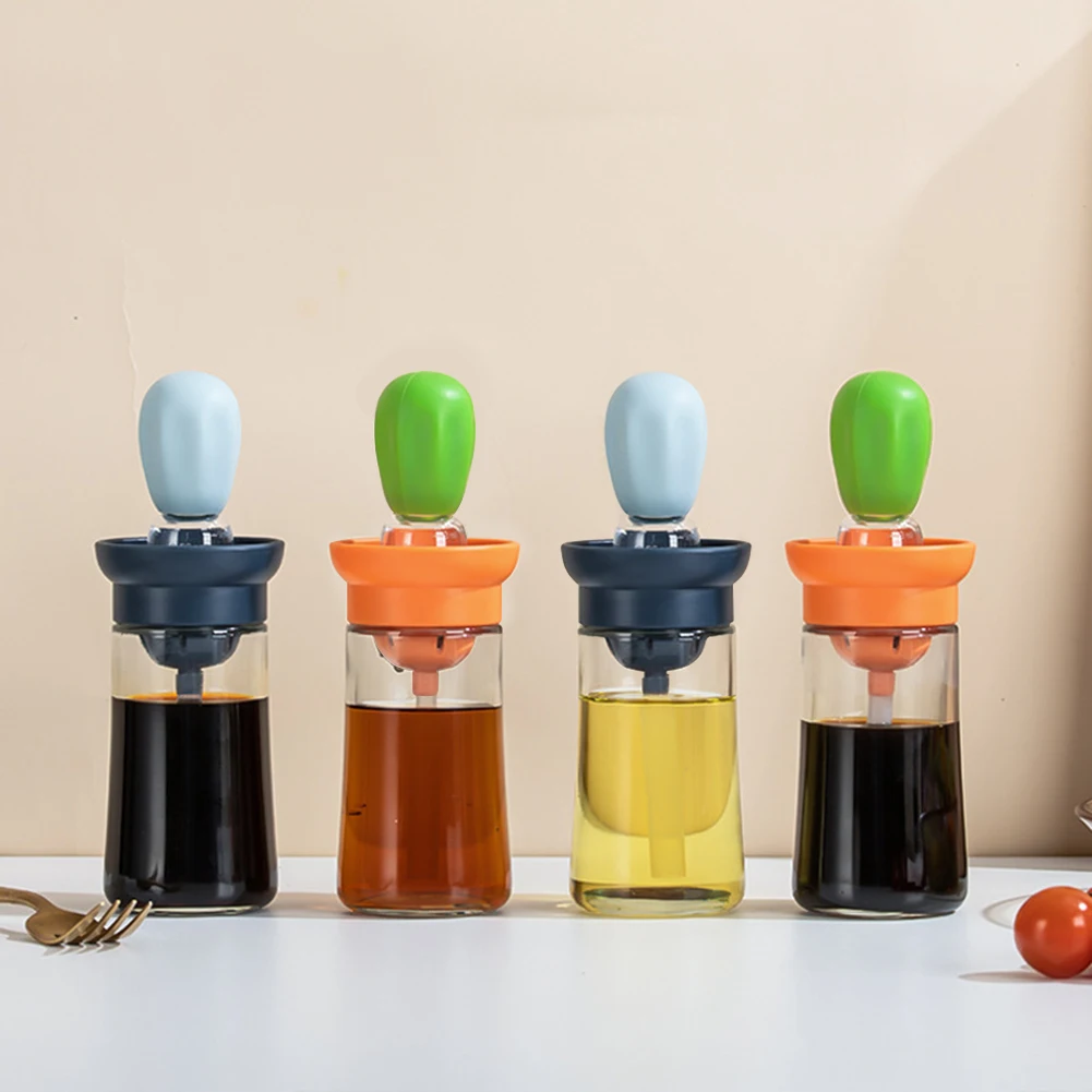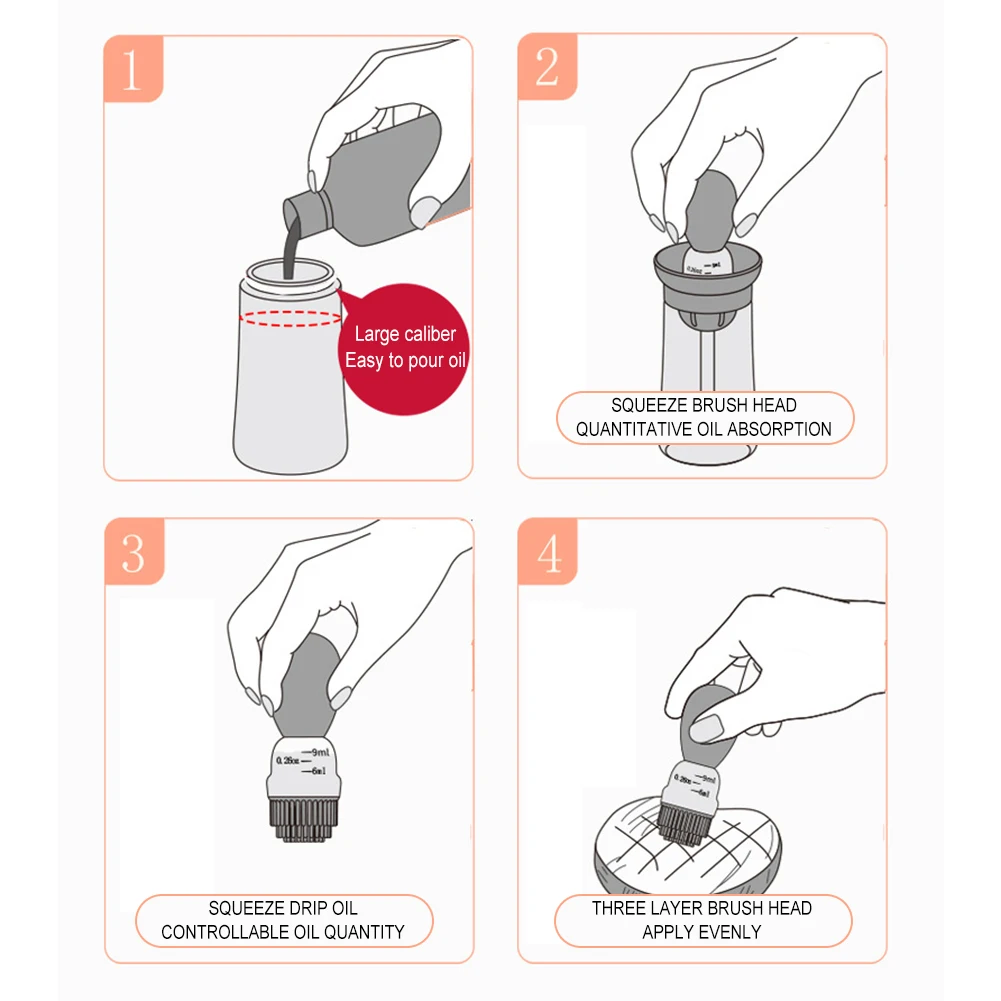 The operation of the oil bottle is very simple. Fill oil from the wide mouth of the glass oil bottle, squeeze the silicone head, the oil will flows from the straw to the transparent space, and then you can squeeze the silicone head to gently spread on the pan or grilled food. The oil return hole design avoids oil waste and overflow, making the kitchen countertop more tidy.