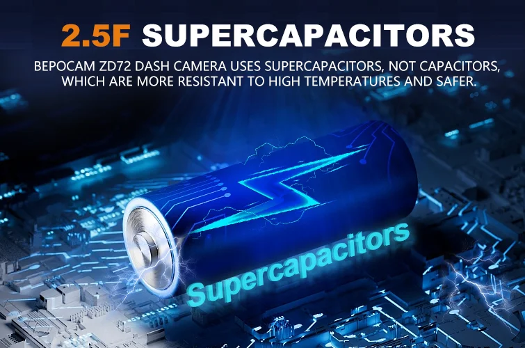 BEPOCAM ZD72 Dash Camera use supercapacitors, not capacitors, which are more resistant to high temperatures and safer.