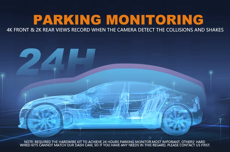 A dedicated hardwire kit is required for this function. The 4K dash cam support 24 hours parking monitoring only when it is connected to our hardwire kit (not included in the package).