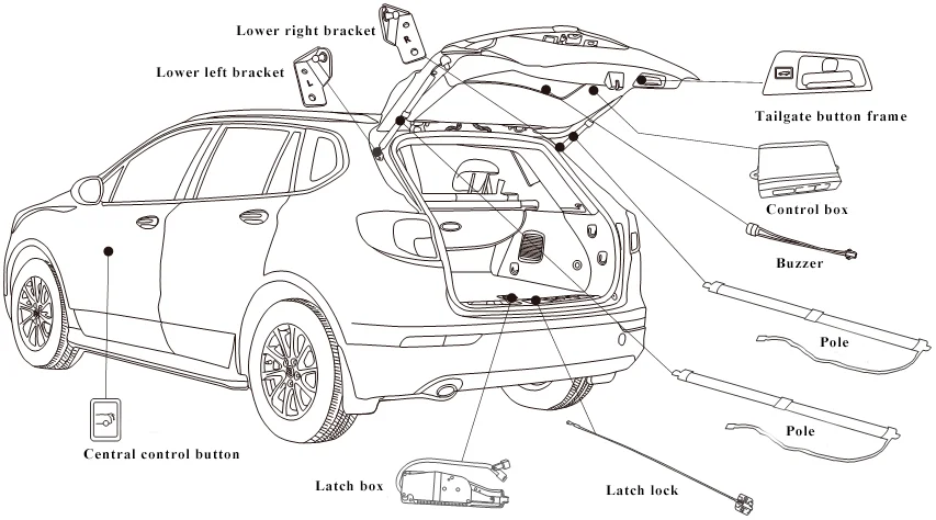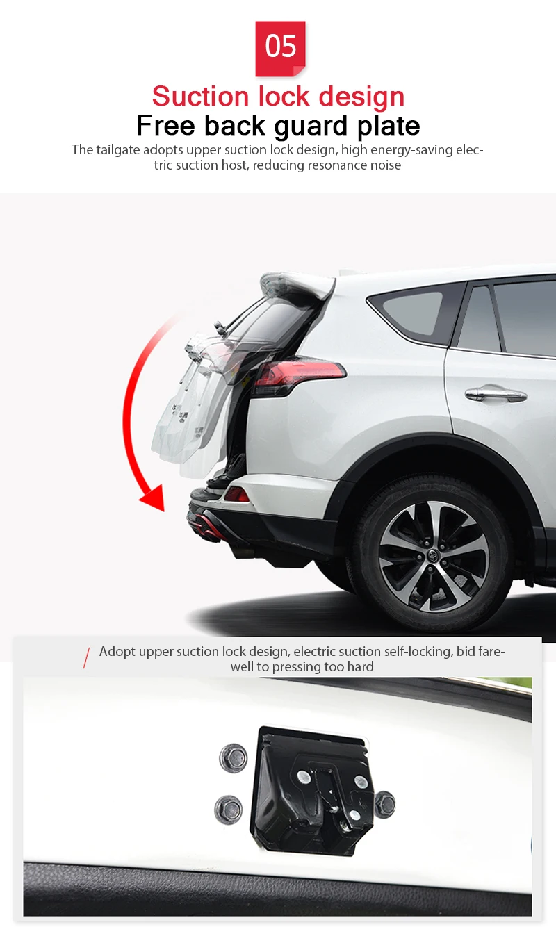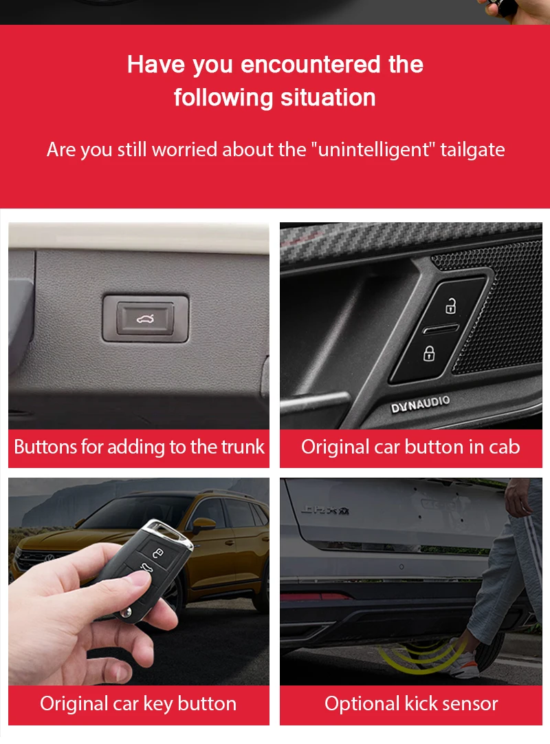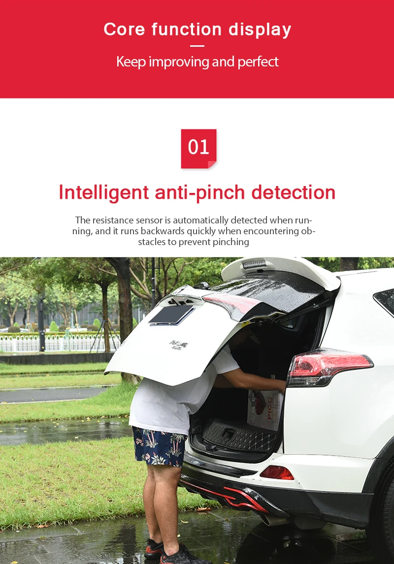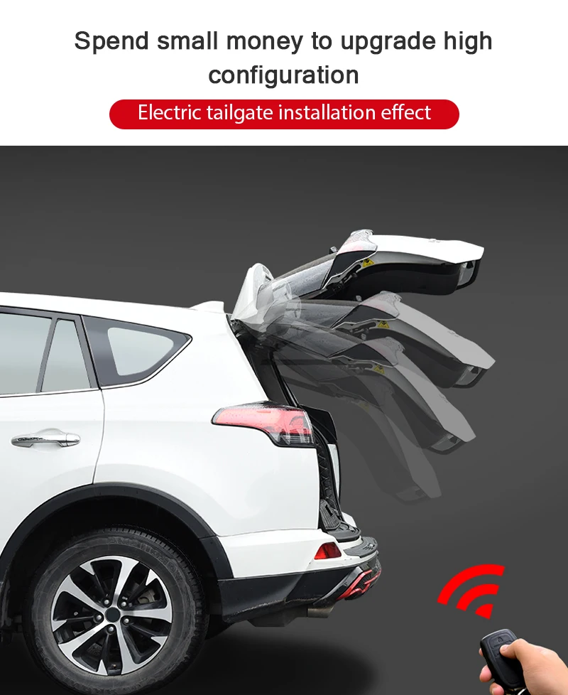 Totally reform the way car owner use the heavy trunk, you will control the trunk easily and conveniently.  driver could use remote control, press on buttons of tail gate or      driver's room to control it.  Otherwise, it has function of smart avoid pinch, memory of height and so on