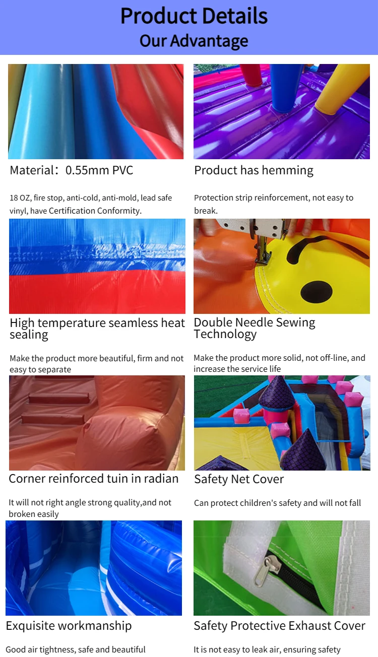 【Sturdy Material】Best FULL PVC material, which is 5 times durable than nylon. Waterproof and UV resistant; Adopting industrial grade double stitching process, 2-4 stitching process is used in the stress zone, such as climbing zone, water slide zone, side and bottom.