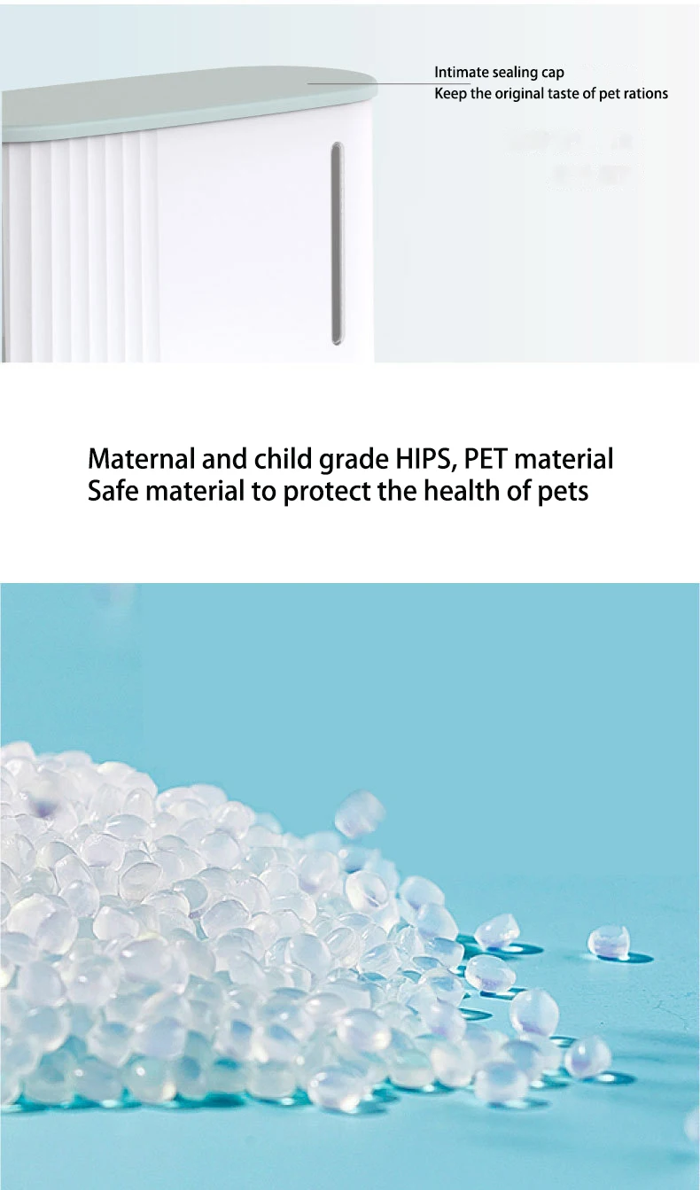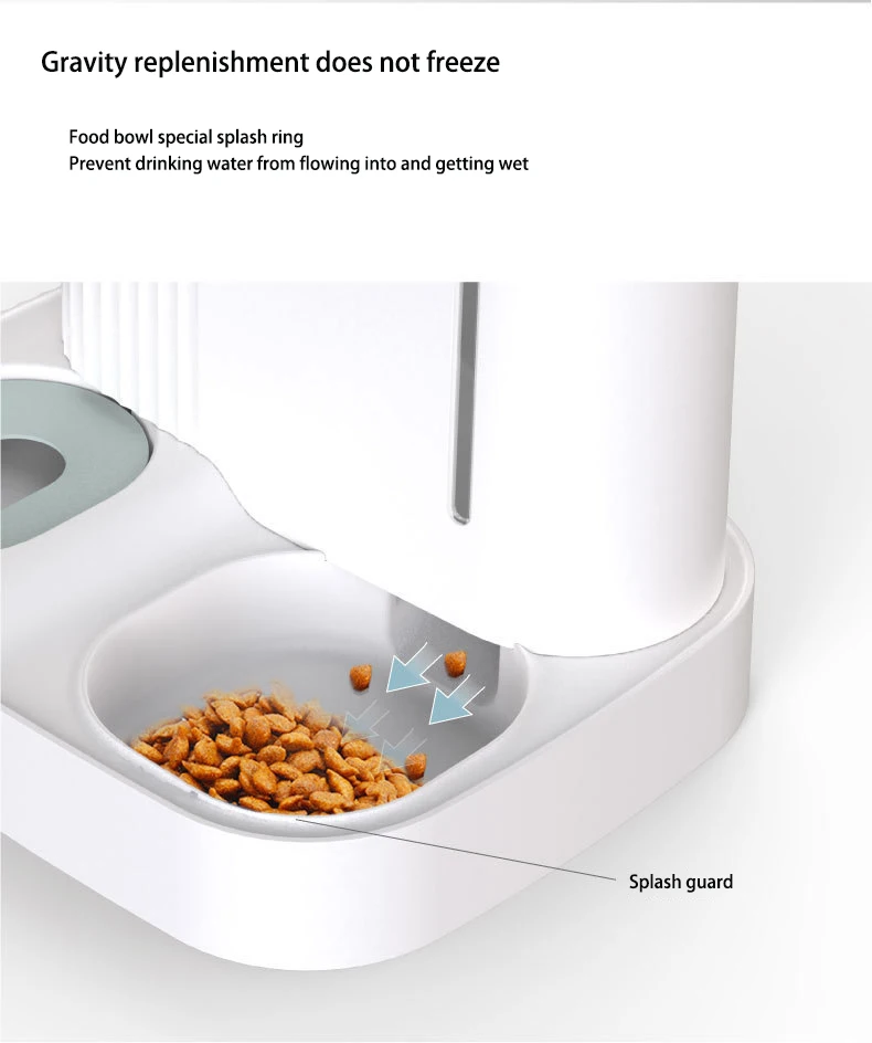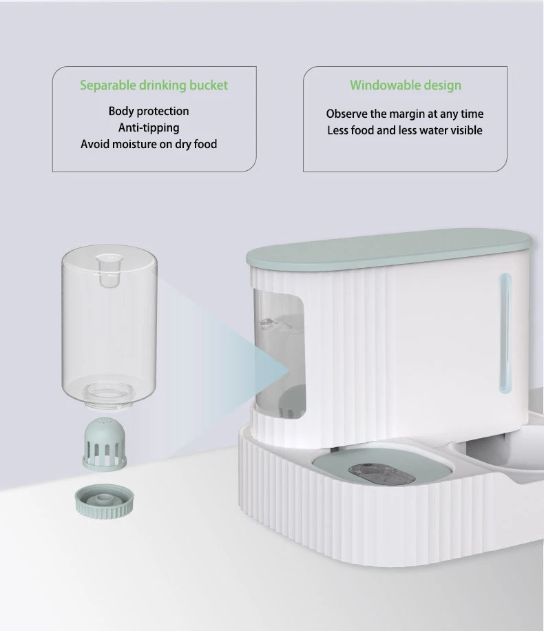 1. Automatically supply water and food, 3L food bucket 0.85L water bucket; uninterrupted food and water supply, so that pets can eat healthy food at any time, rest assured