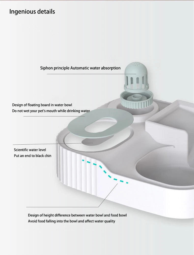 2. The principle of siphon, automatic water refilling, floating board design does not wet the mouth, scientific water level design rejects black chin, and unique ingenuity to prevent cat food from falling into the water bowl and polluting the water.