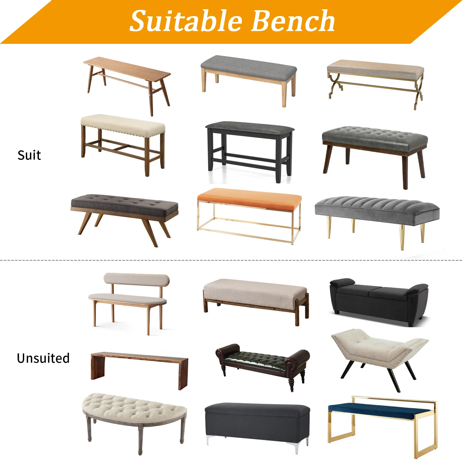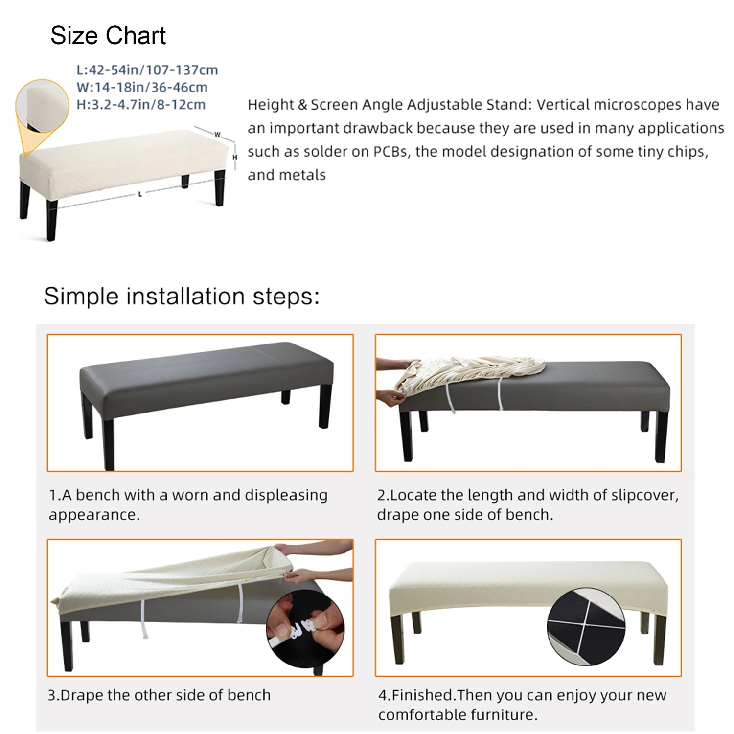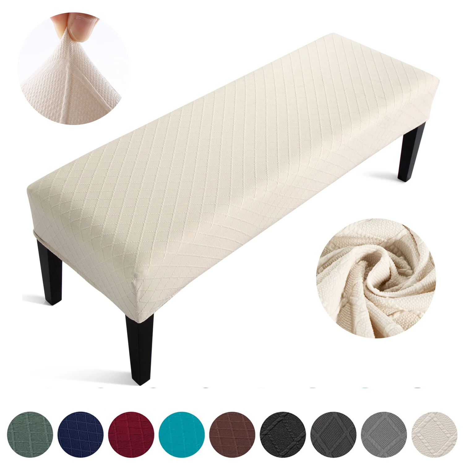 The bench covers available in a variety of colors,Will fit most of regular size upholstered dining bench 42" to 54” long,14" to 18” wide, 3.14 -4.7 height'. Please check the Size Chart in product picture before order【important】
