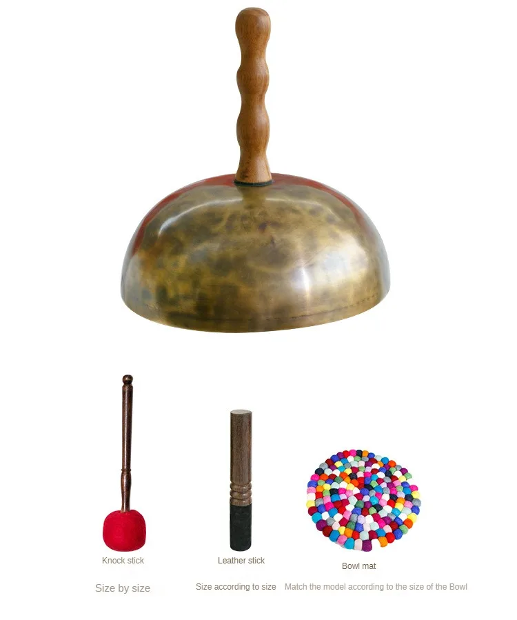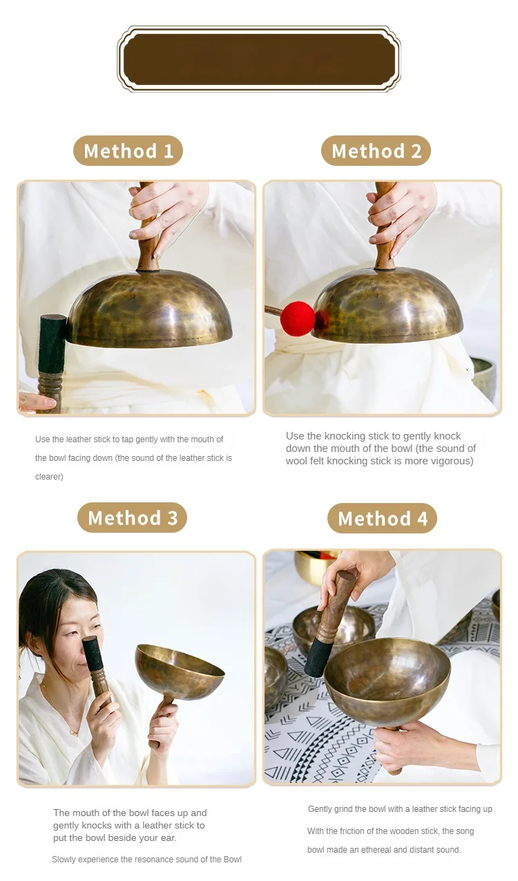 When you get a singing bowl, don't rush to make it sound, you should feel it with your heart. First the left hand flat, put the bowl in the center of the palm, the right hand hold the small wooden handle and then gently wipe the bowl with the lower end of the handle, clockwise or counterclockwise, so slowly wipe around the diameter of the bowl, with strength and strength to be even, from fast and slow, slowly the Buddha sound bowl will vibrate with the friction of the wooden handle and emit a pleasant resonance sound, the sound is more and more loud around the beam, its sound is ethereal and far-reaching. For large bowls, you can place them on a cushion and gently hold the lower side of the bowl with one hand. The principle is the same, you can't touch the wall of the bowl if you hold one edge of the bowl while you knock, even if you use a lot of force, there will be no sound and no vibration.