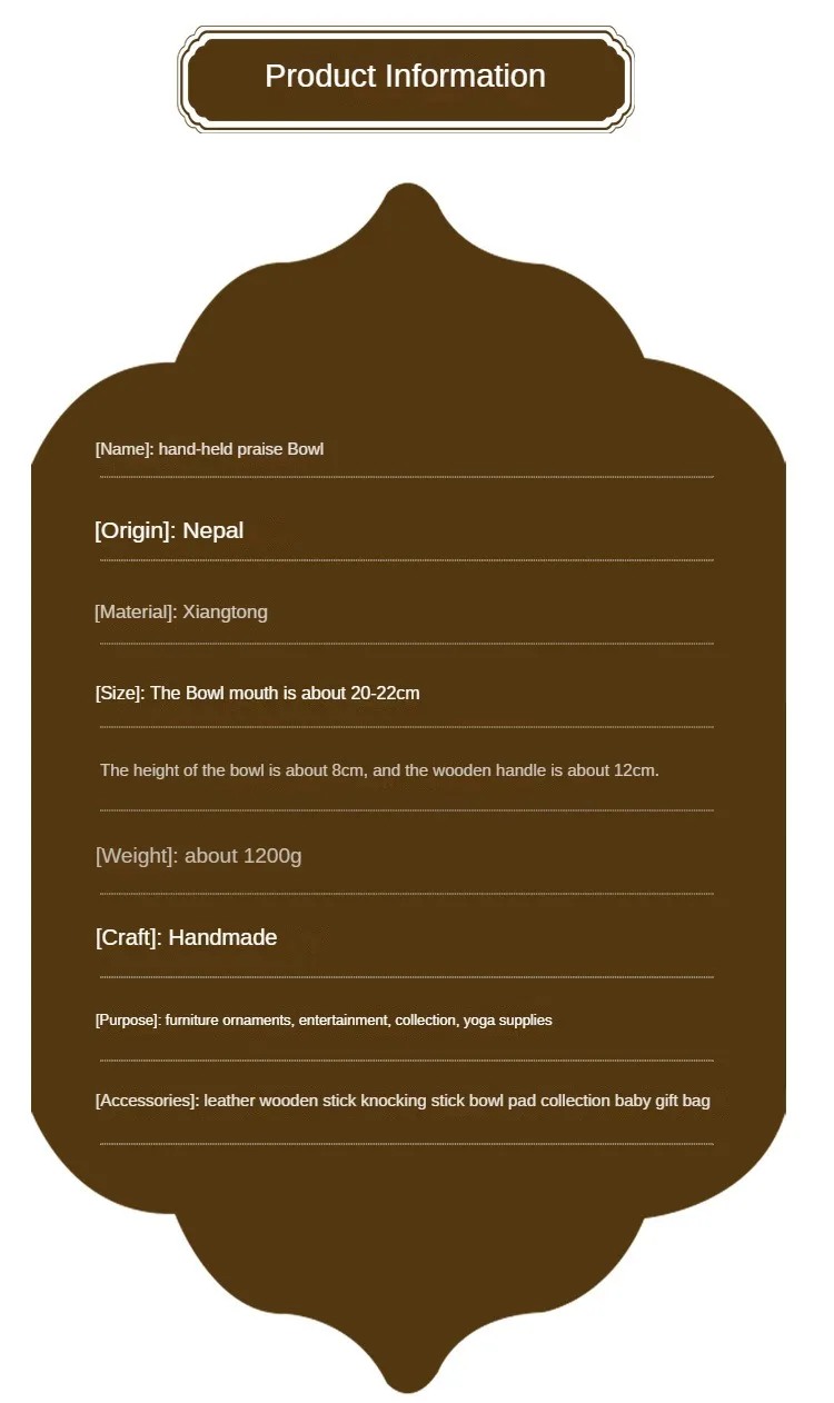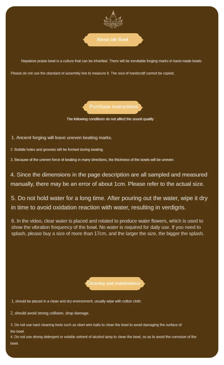 The bowl is made from a mixture of five to 12 metals, mainly brass. In the process of producing the bowl, the metals are first melted and mixed together, and then cooled in the casting mold to make the rough form of the bowl. However, due to the reason of casting, it is inevitable that there will be bubbles or uneven phenomena inside, so it is also necessary to reheat and hand-detailed hammering, so that the uneven bowl wall becomes uniform, the loose texture becomes fine, and the hammer connection forms a complete layer!