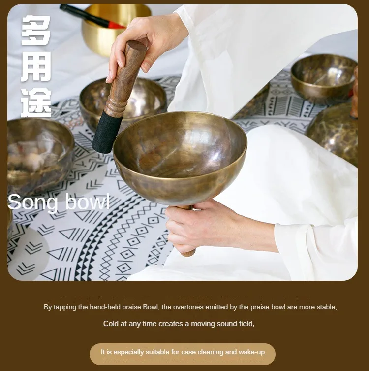 In the course of daily use, the Tibetan people found that many bowls used as food vessels can make wonderful sounds when they are knocked, which is quiet and distant, enabling people to quickly enter a deep state of meditation, and opening the door for the body to heal itself, relieving mental and physical pain. To this day, many modern people continue this culture, some carrying it around as an integral part of the collection and others used to help with meditation and spiritual practice. In the development of modern sound therapy, the song bowl plays a key milestone role.