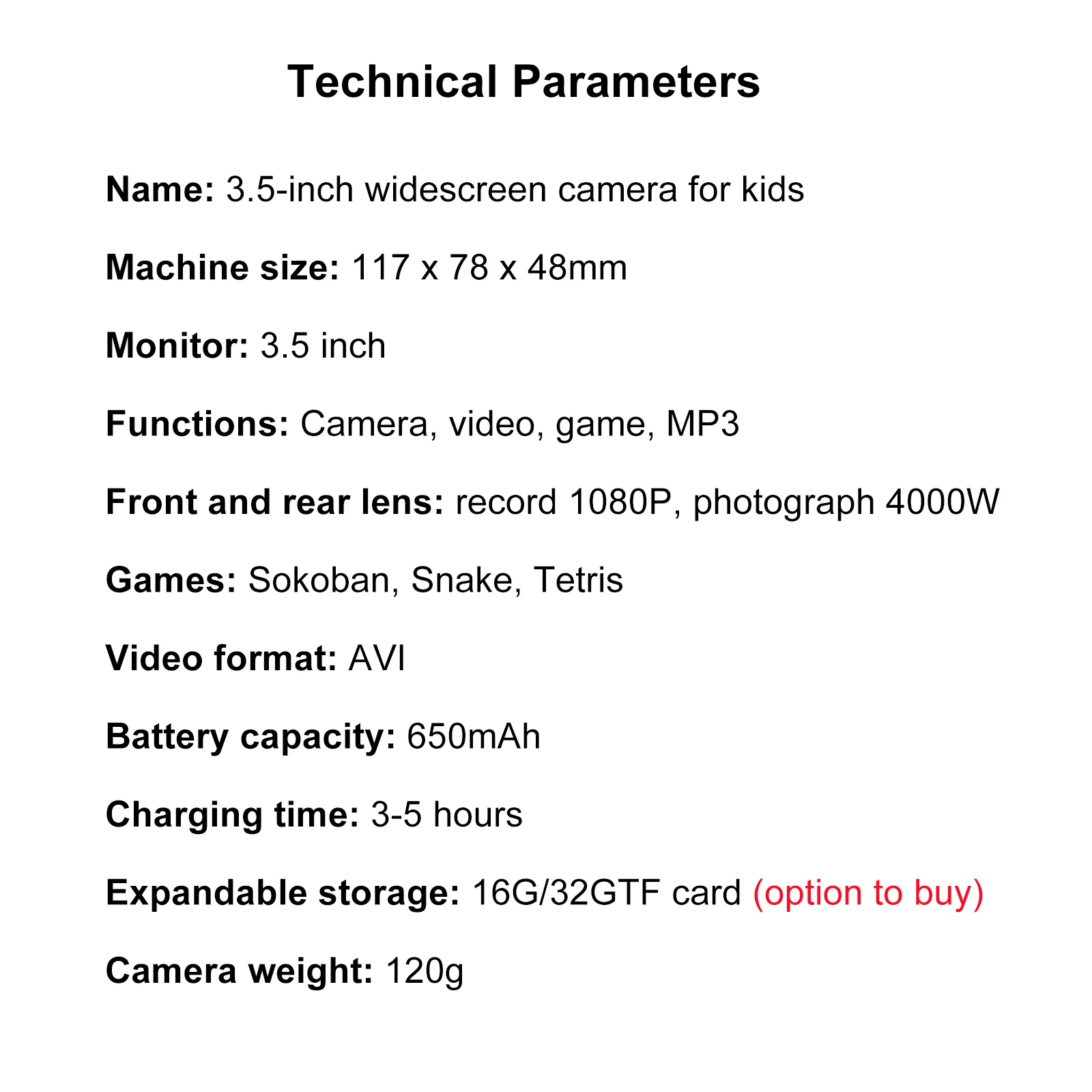 1G TF card can store 400 photos, portable extract-type TF card storage design. Simply replace the memory card to achieve arbitrary expansion at any time, you can also export pictures at any time through the USB data cable (the official standard camera has about 36M storage capacity, can store about 50 photos).
