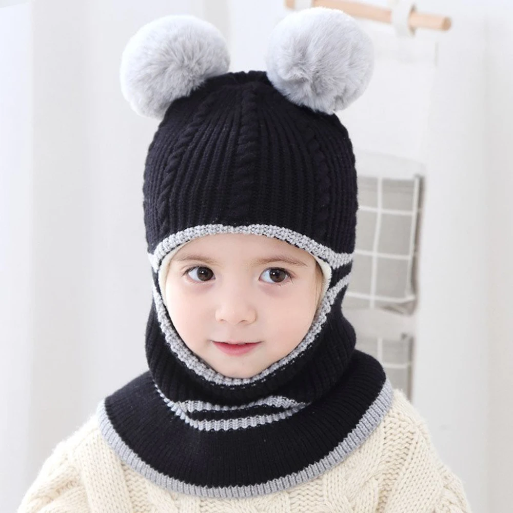 Boys Girls Knitted Woolen Hat Winter Baby Warm Hats With Scarf Cover For Kids 1-6 Year