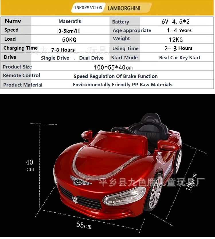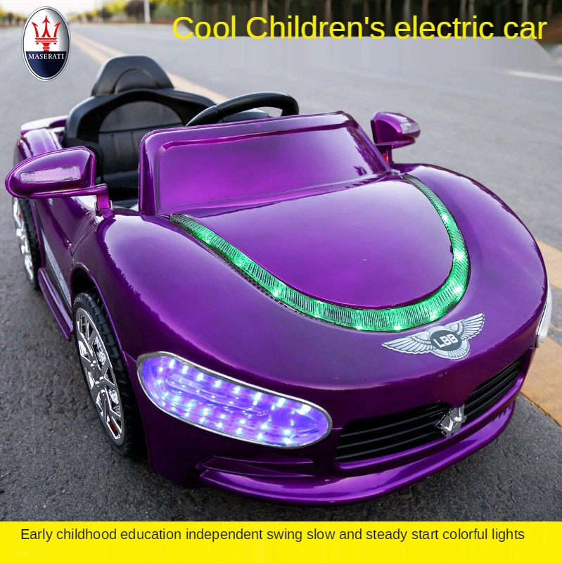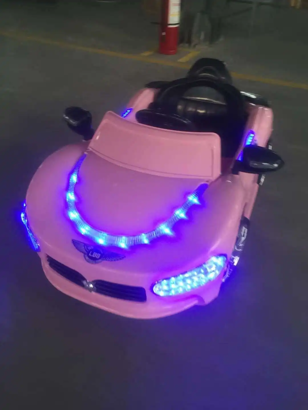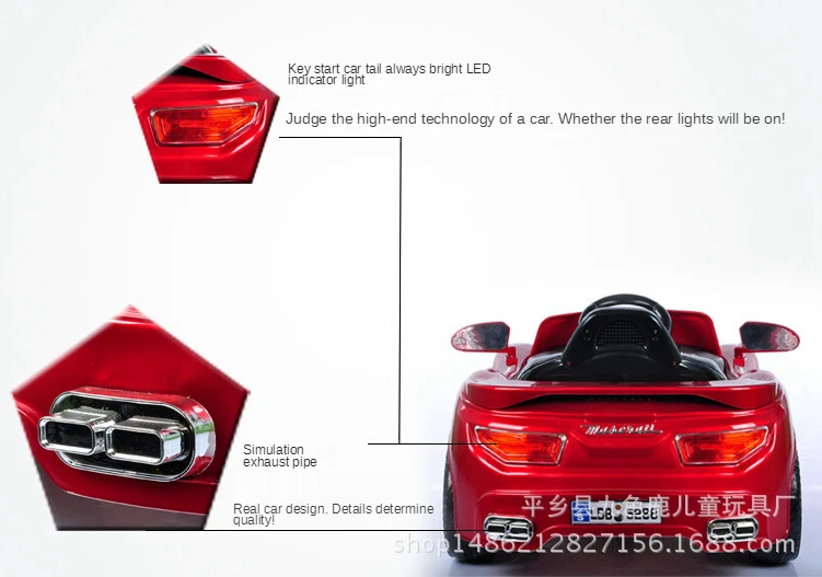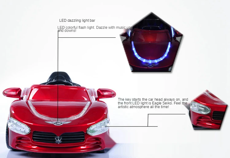 Car paint: multi-function acousto-optic effect, multi-function music steering wheel; colorful LED lighting settings: colorful water, instrument panel, headlight, hood, rear-view mirror, tail light; forward and backward when; with MP3 and volume adjustment function; powerful dual drive power configuration; With current overload protection device and charging protection function, equipped with safety belt and anti-skid wheel belt, driving is safer