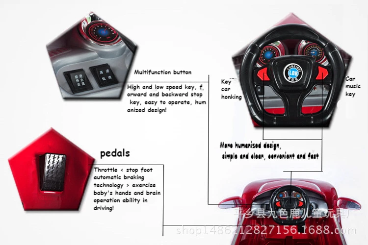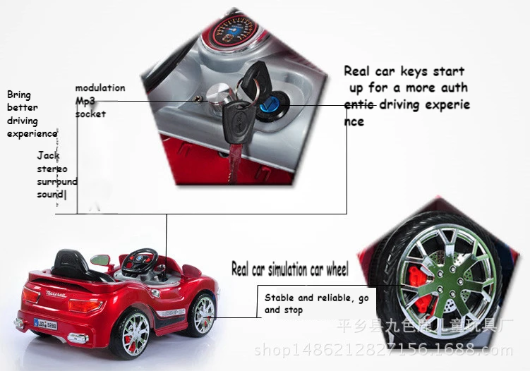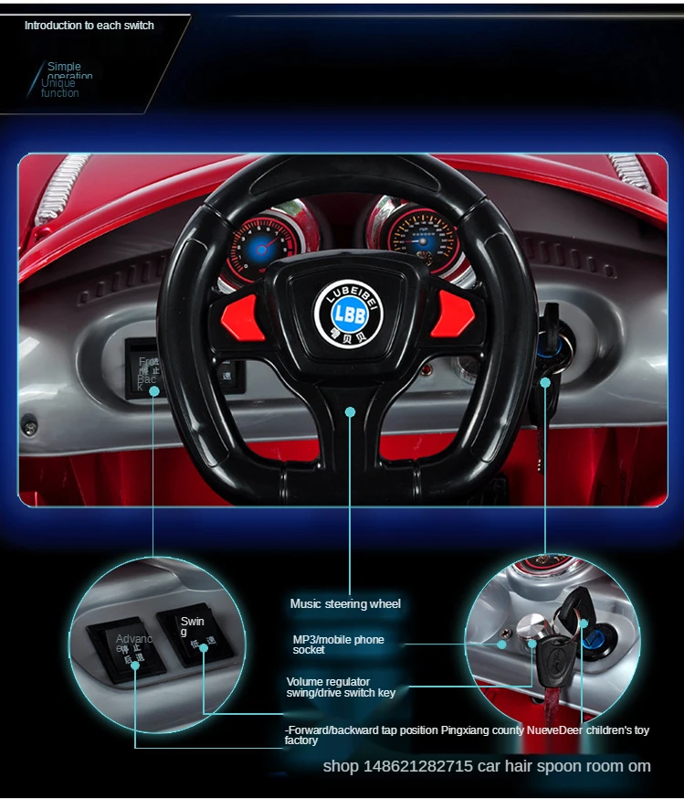 Top configuration:7.0a battery dual drive + remote control + music light + safety belt + early education function (support mp3, memory card, USB, can connect to mobile phone) + swing function